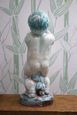 Michael Andersen glaseret keramik (Bornholm - 3266) figur af dreng med trompet. H: 22,5cm. Figuren har et lille glasur afslag på toppen og et lille kantafslag i bunden , se extra billeder !