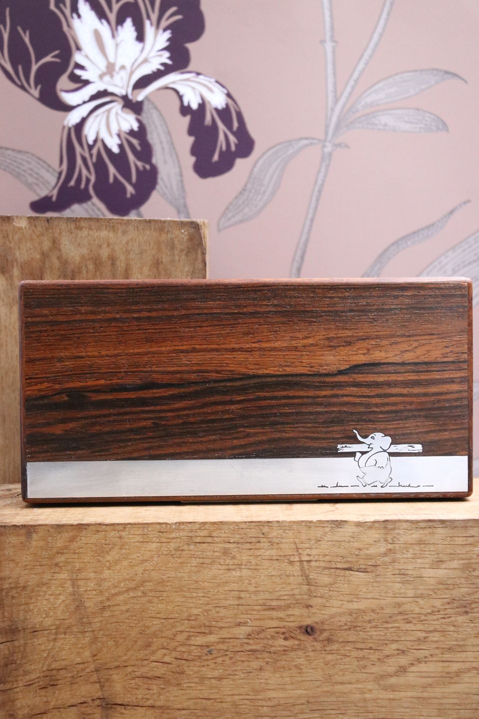 Aflang æske i palisander dekoreret med sølv indlægning med motiv af lille elefant som bære en træstamme på skulderen.