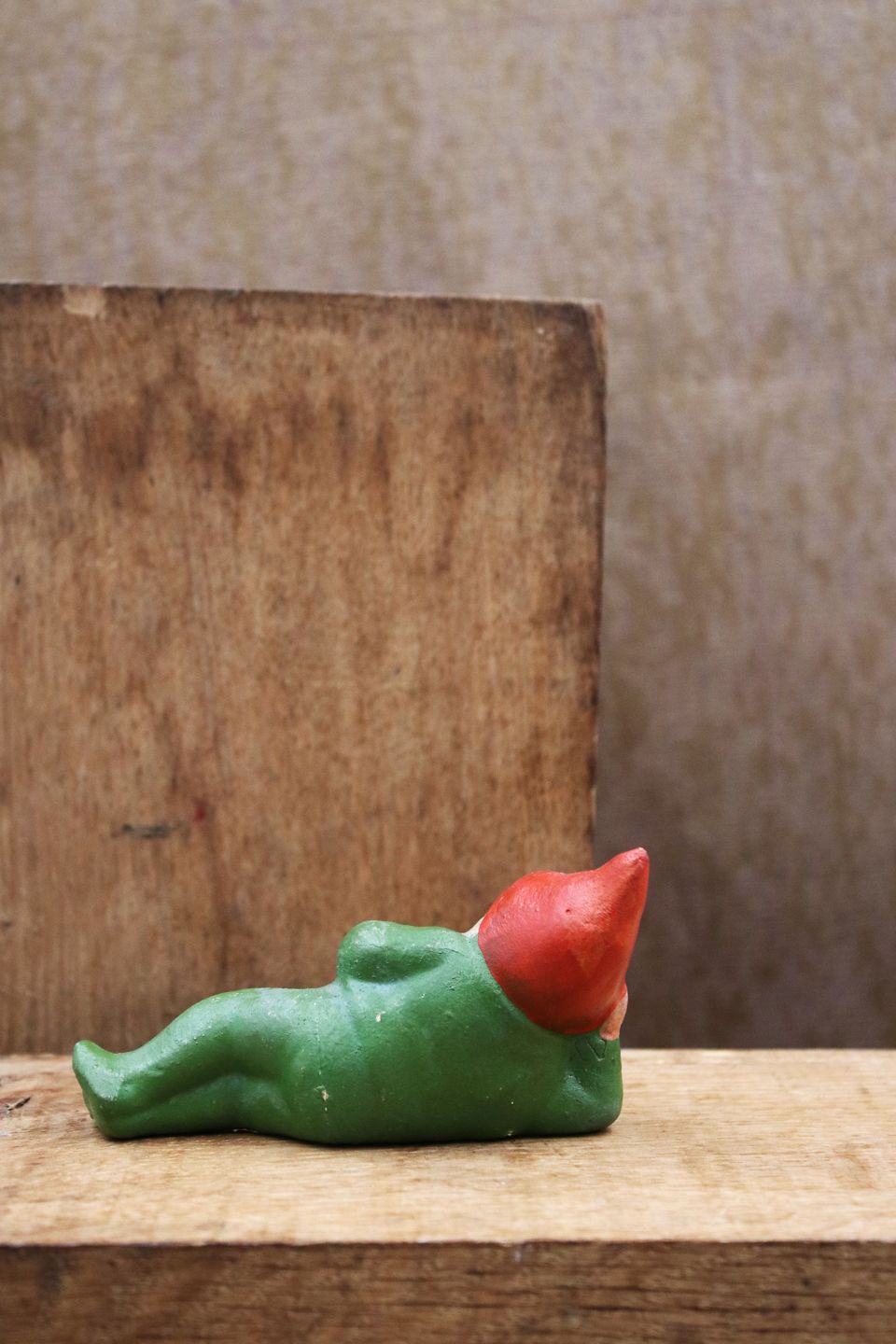 Dekorativ gammel bemalet terrakotta julenisse med fin patina. H: 5,5cm. L: 11cm. Emne nummer: Jul nr.652