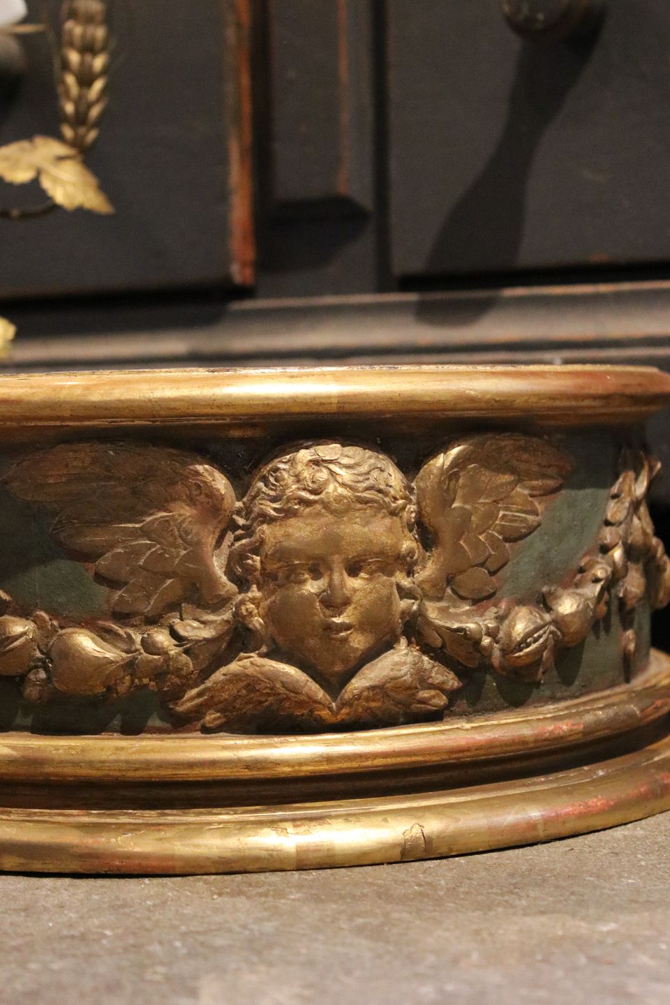 Dekorativ , fransk 1800 tals piedestal i træ med engle motiv , gammel original blå bemaling og guld dekorationer , samt en fin patina.