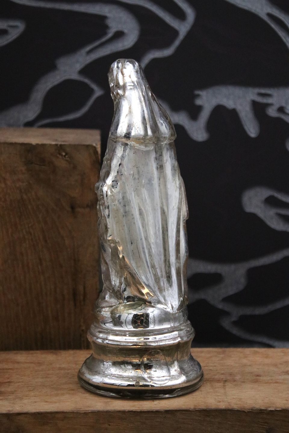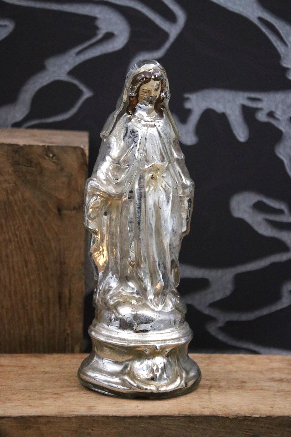 Antik 1800 tals Madonna figur i fattigmandssølv / Mercury glass. Højde:21,5cm. Emne nummer: Fattigmandssølv madonna 2