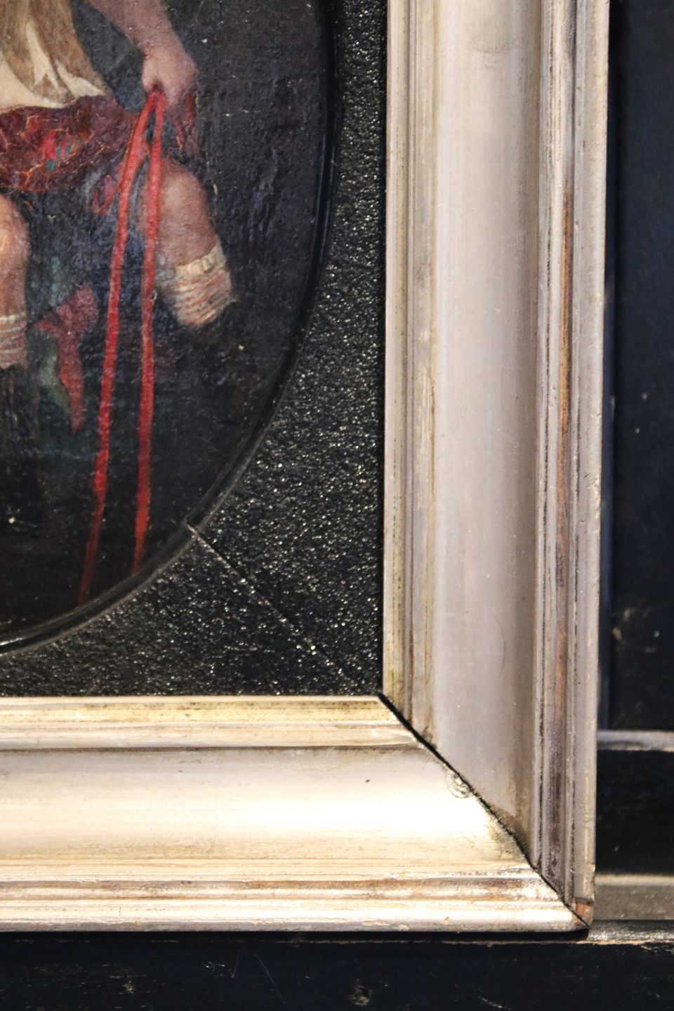 Dekorativt 1800 tals oliemaleri malet på træ med motiv af 2 børn siddende på stol. Maleriet er indrammet i gammel sølvbelagt træramme.