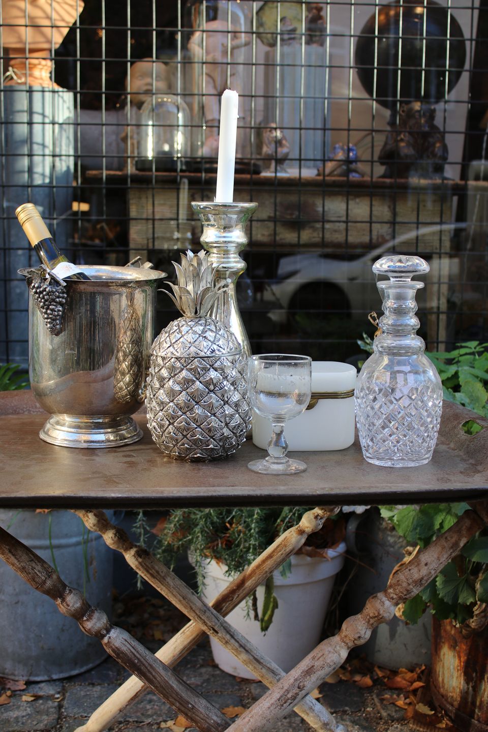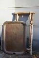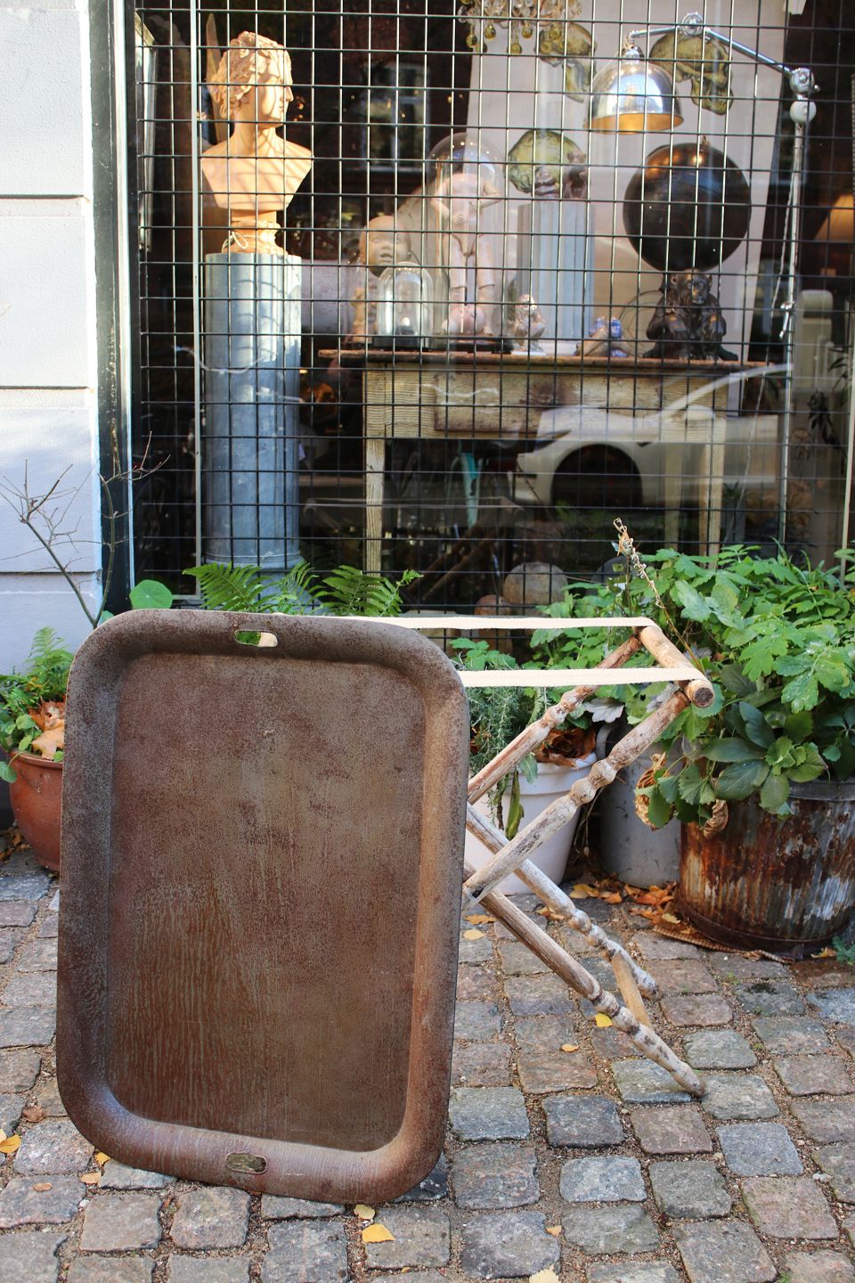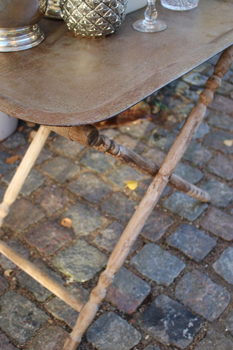 Old tray table with wooden base with a really nice patina and large raw metal tray on top. H: 68cm. L&W: 76.55.5cm.