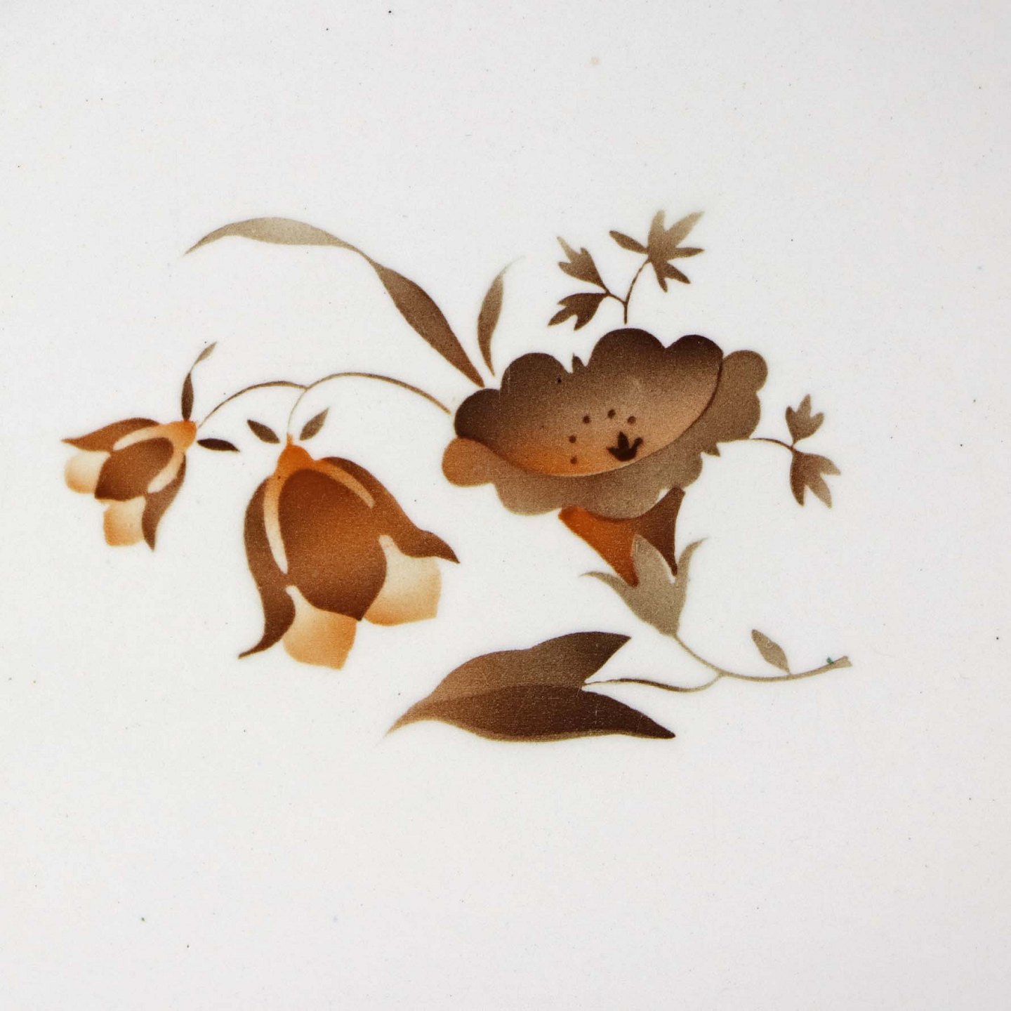 Stel i glat hvid fajance i stelform C med dekoration af brune snerleblomster og lysebrun kant med bladmotiv. Stellet blev produceret i perioden år 1930-1941