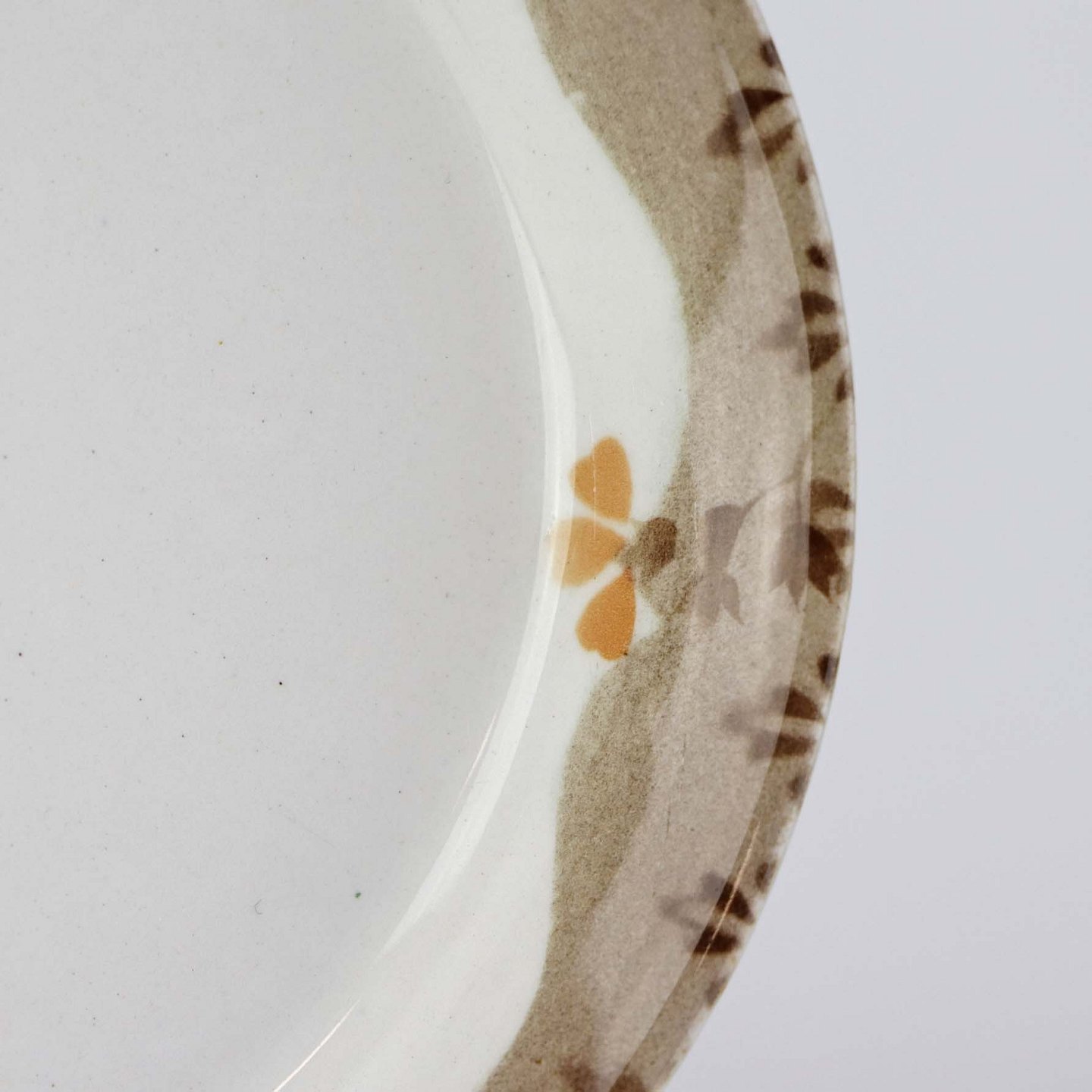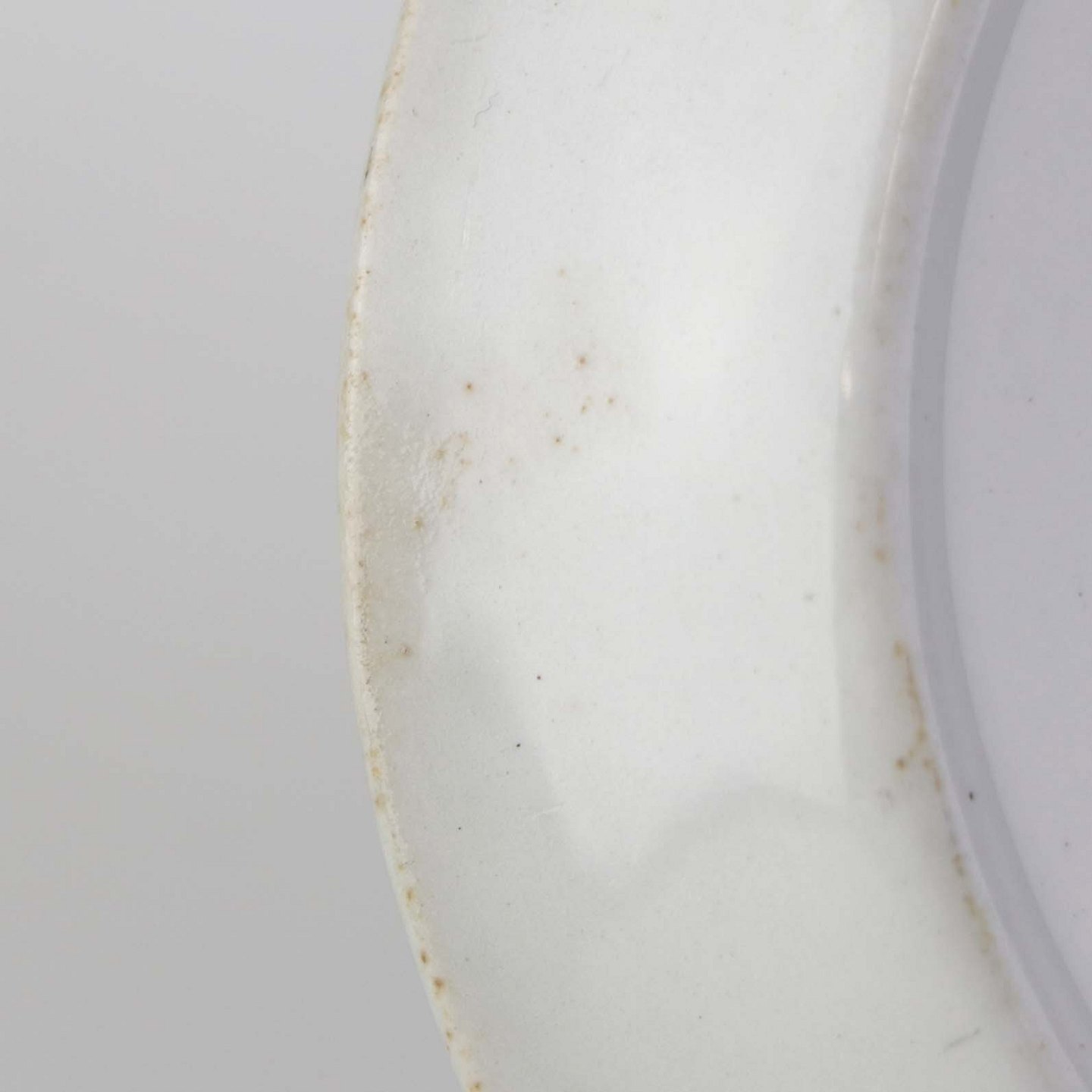Fremstår med mørkning under glasuren på fadets underside.