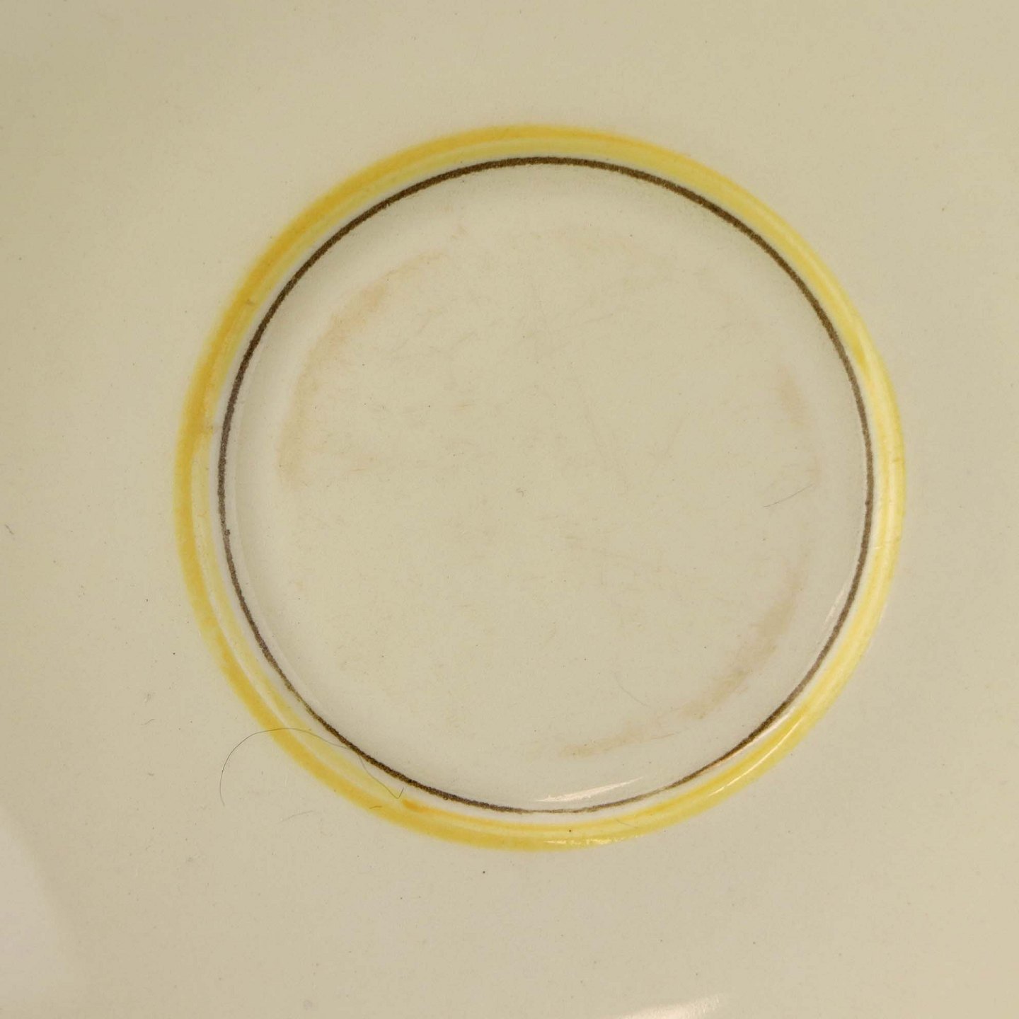 Stel i glat gul fajance med dekoration af farverige og forskelligartede blomster samt med gul og sort kantstreg.