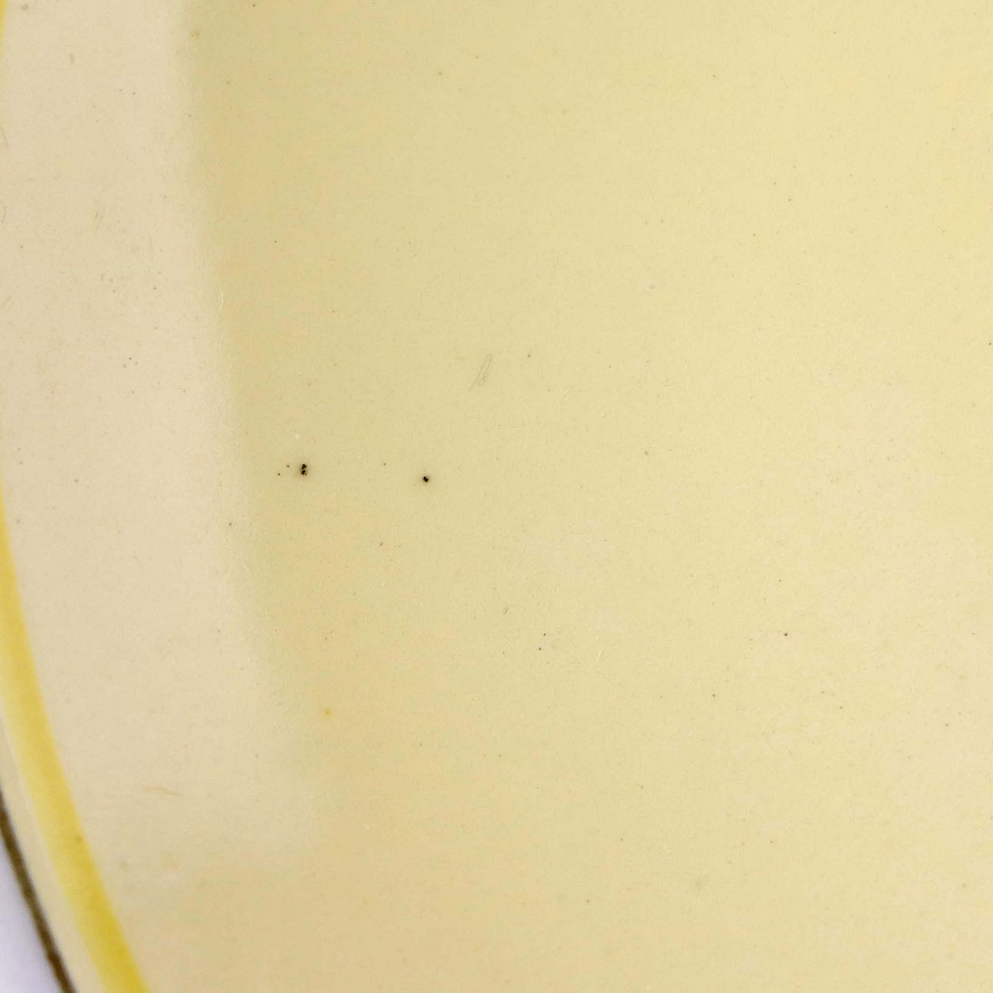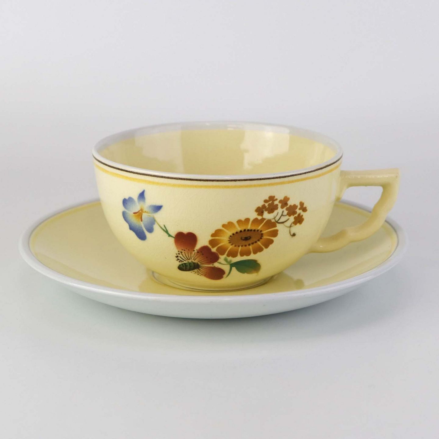 Stel i glat gul fajance med dekoration af farverige og forskelligartede blomster samt med gul og sort kantstreg.