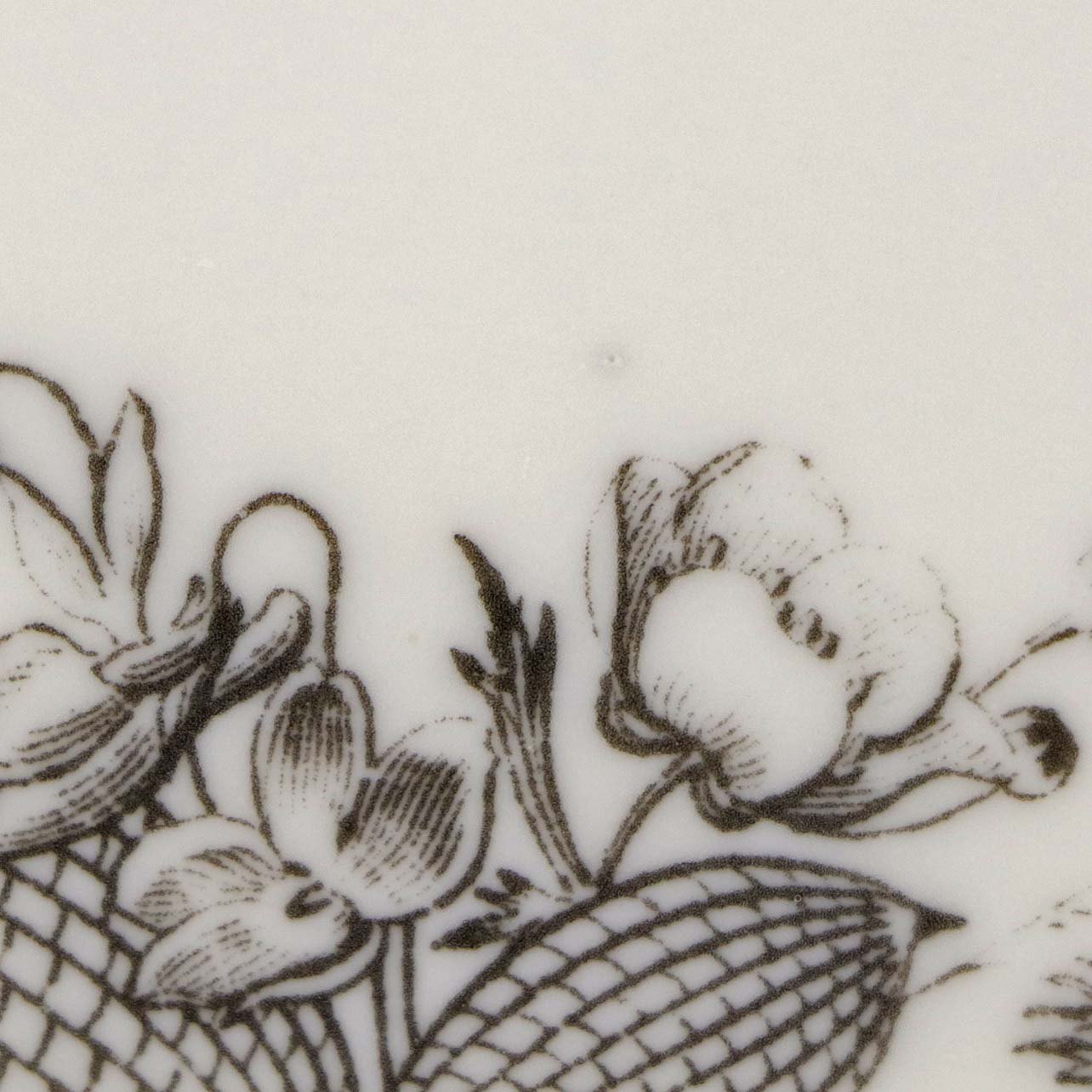 Service i glat cremefarvet porcelæn med grøn og sort kantstreg samt dekoration af blomster og grene i sort streg.