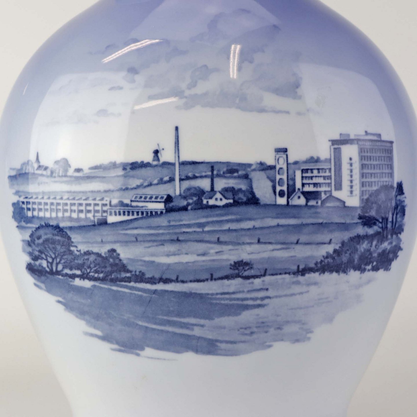 Oval jubilæumsvase i kongelig porcelæn med motiv af Danfoss fabriksbygninger. Nr. 3088