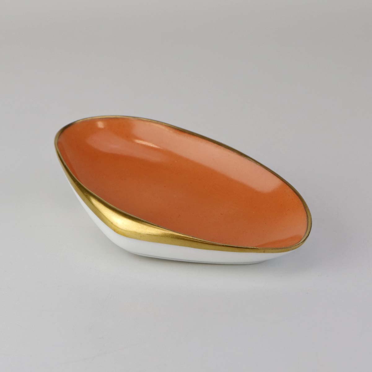 Service i glat hvidt porcelæn med orangerød dekoration over glasuren og guldkant