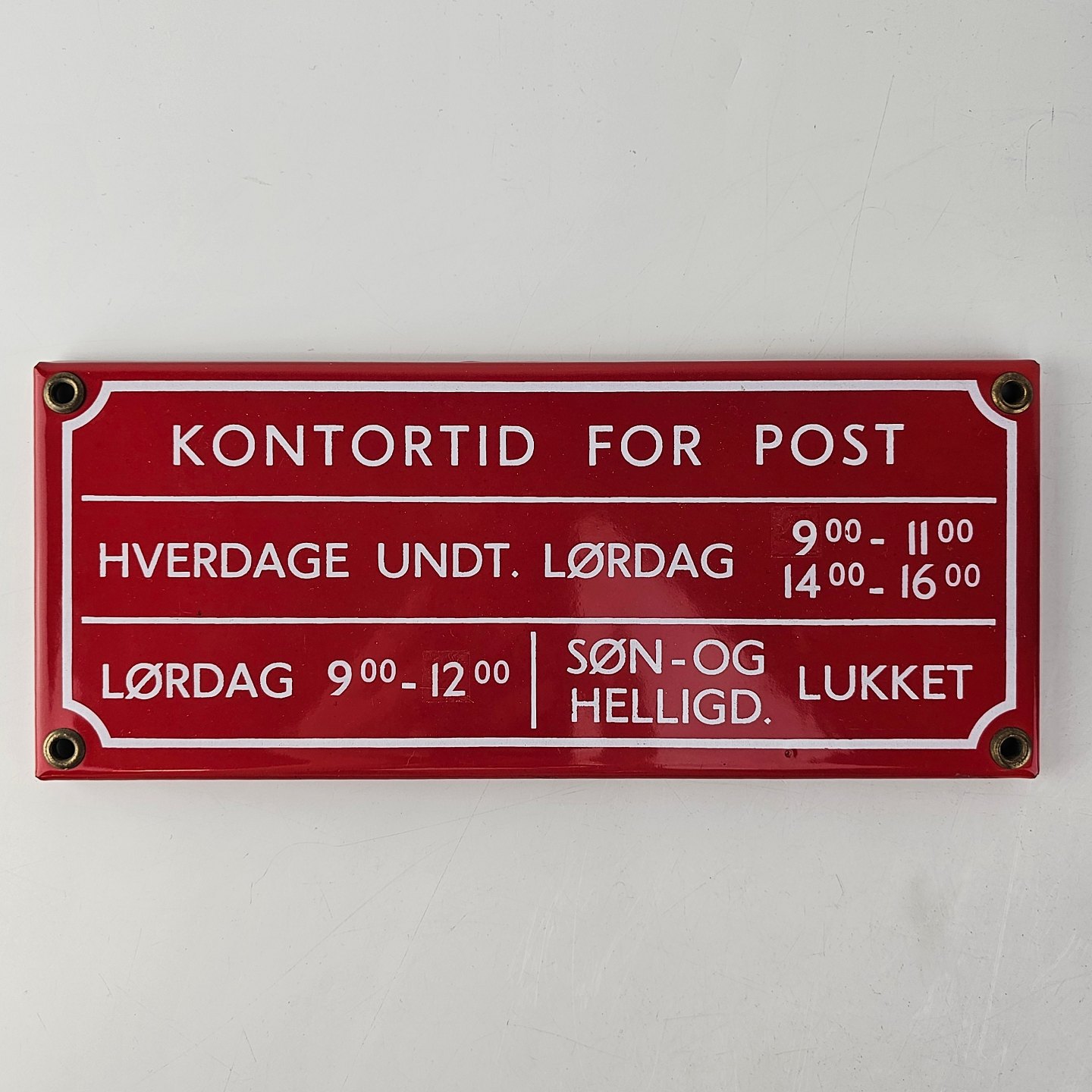 Rødt emaljeskilt med teksten Kontortid for post og åbningstider