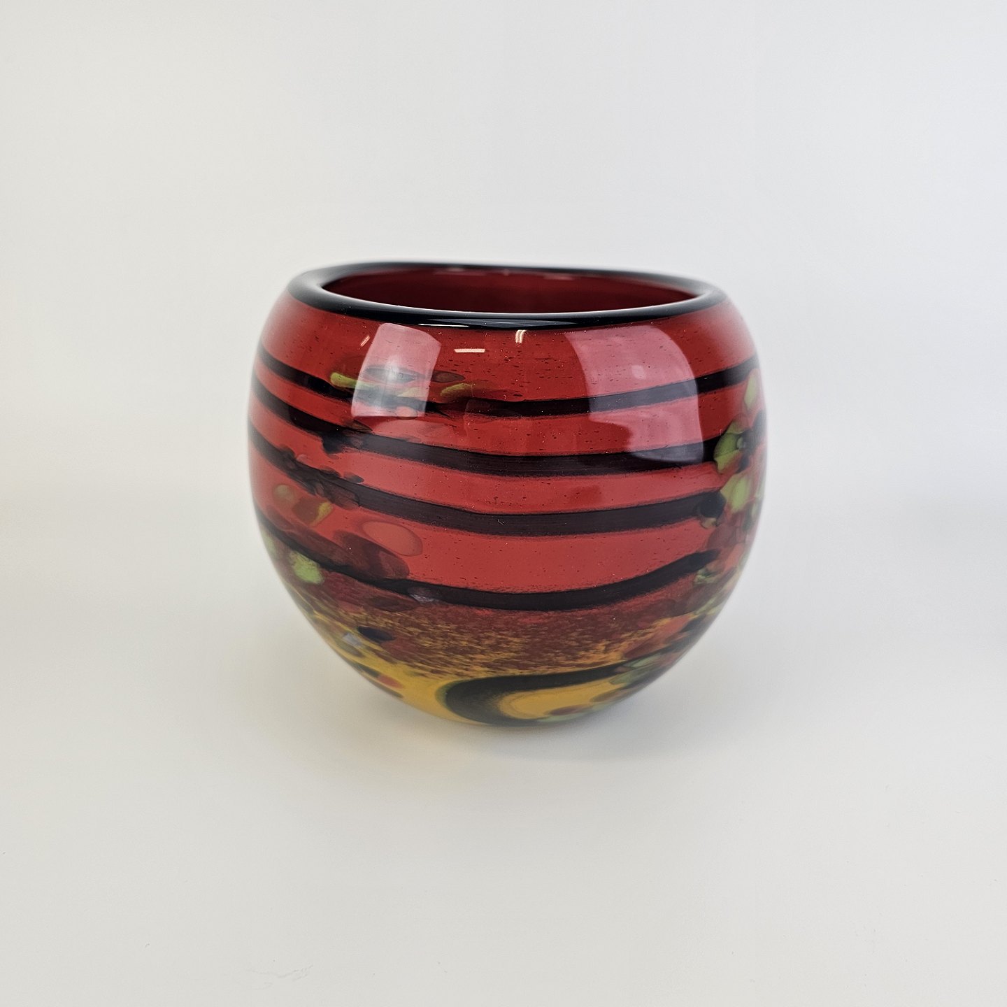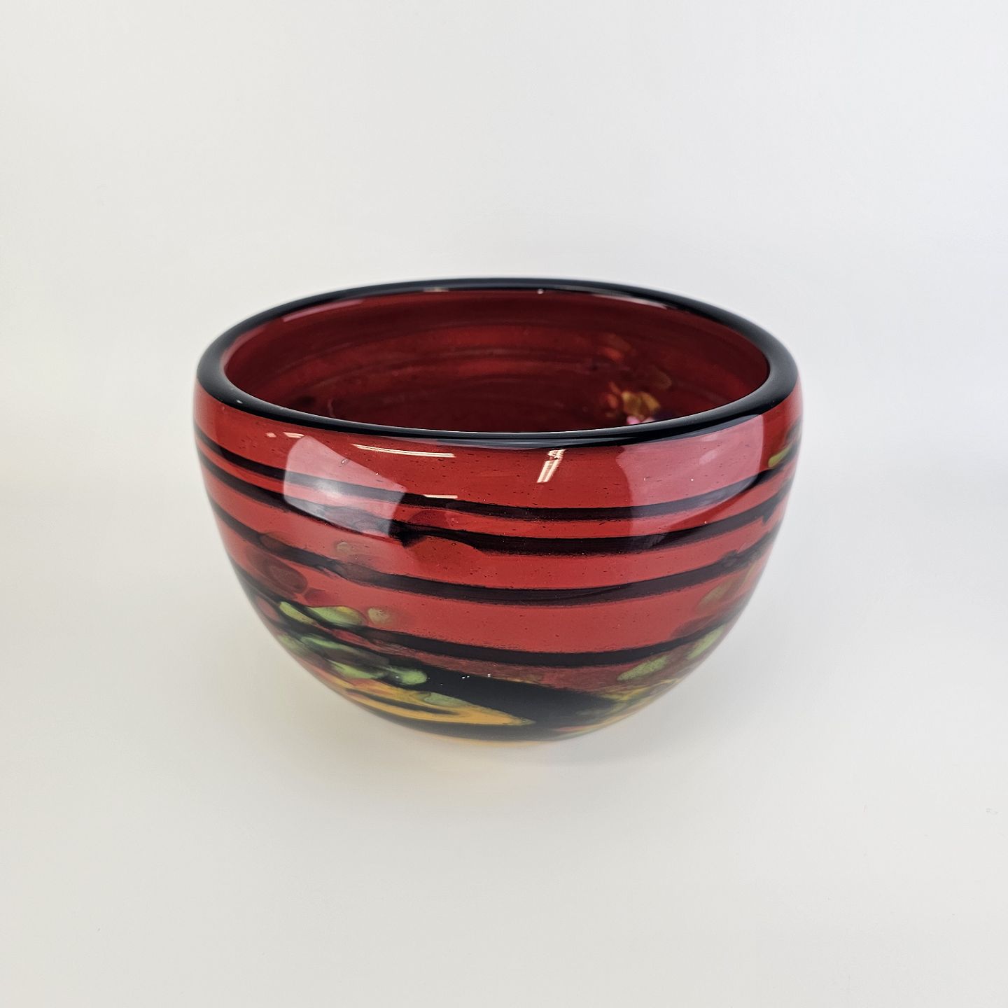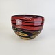 Unika skål i glas med abstrakt mønster i røde, sorte, gule og grønne nuancer