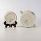 Stel i glat råhvidt porcelæn dekoreret med lysegrøn stribe og guldkant samt motiv af hjertegræs.