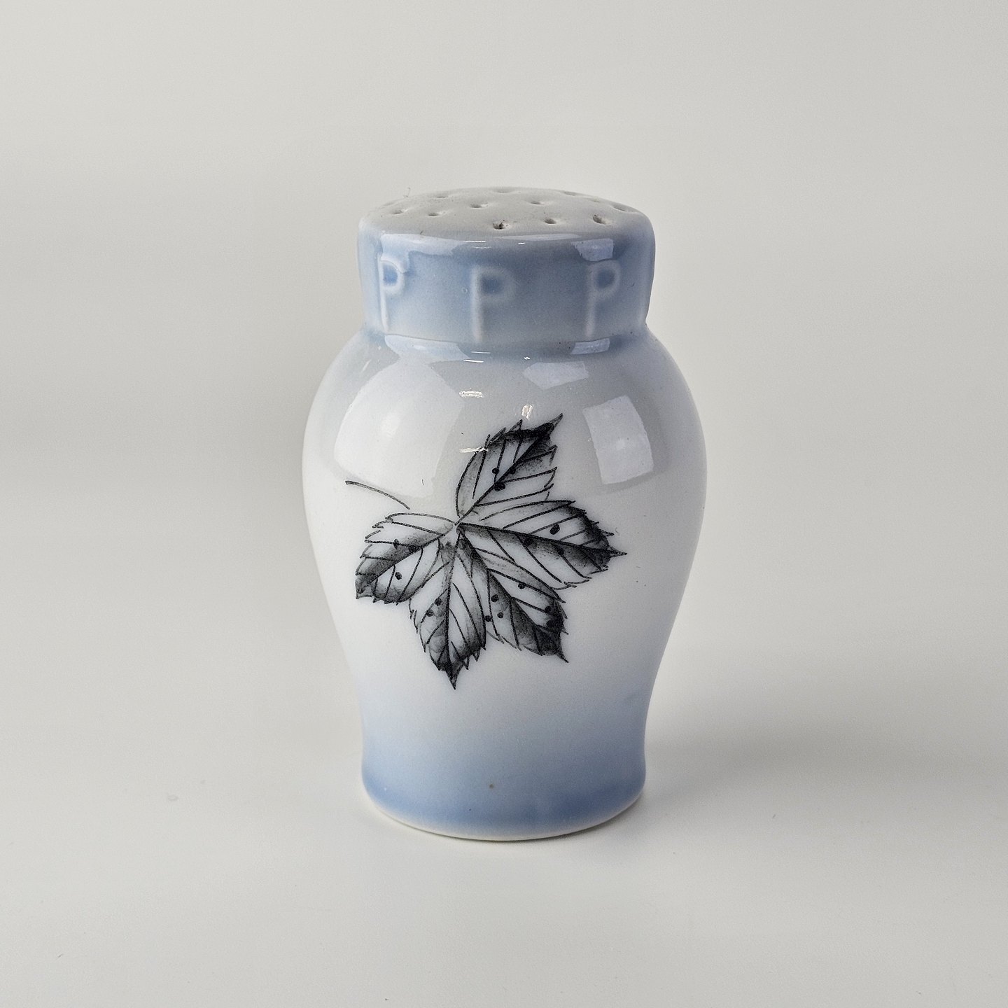 Løvfald er hvidt porcelæn som toner ud i blå, dekoreret med faldende blade i sort og rødt
