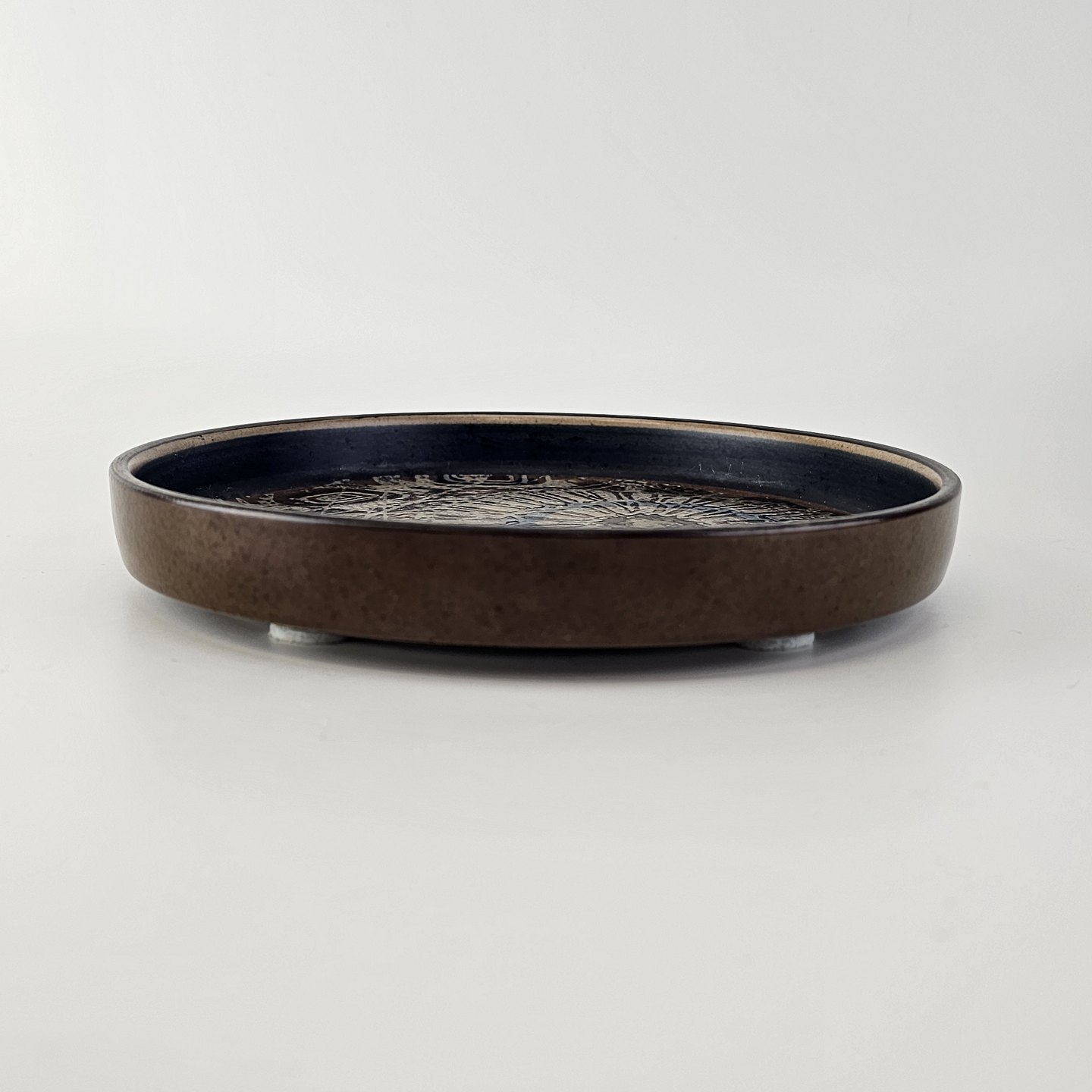 Flad rund skål i fajance fra Baca serien med mønster i brune nuancer