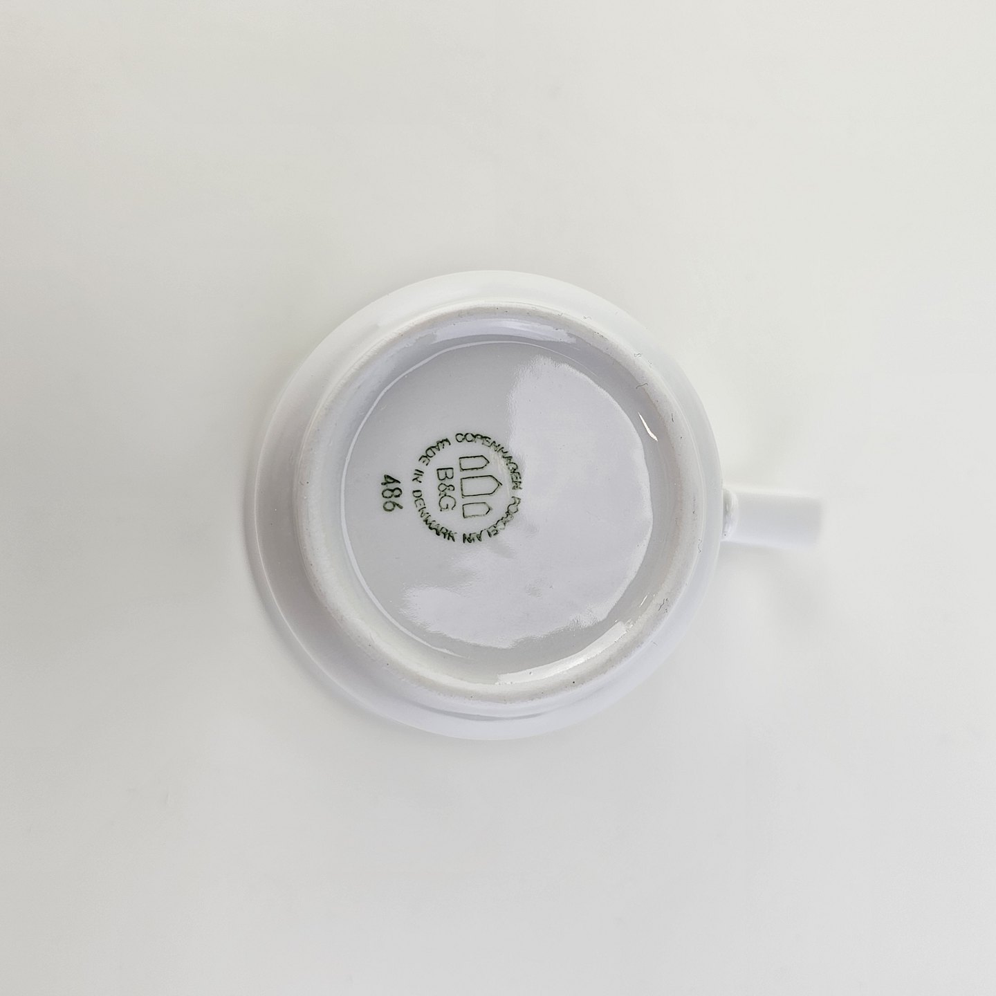 Kop med høj hank og underkop i glat hvidt porcelæn