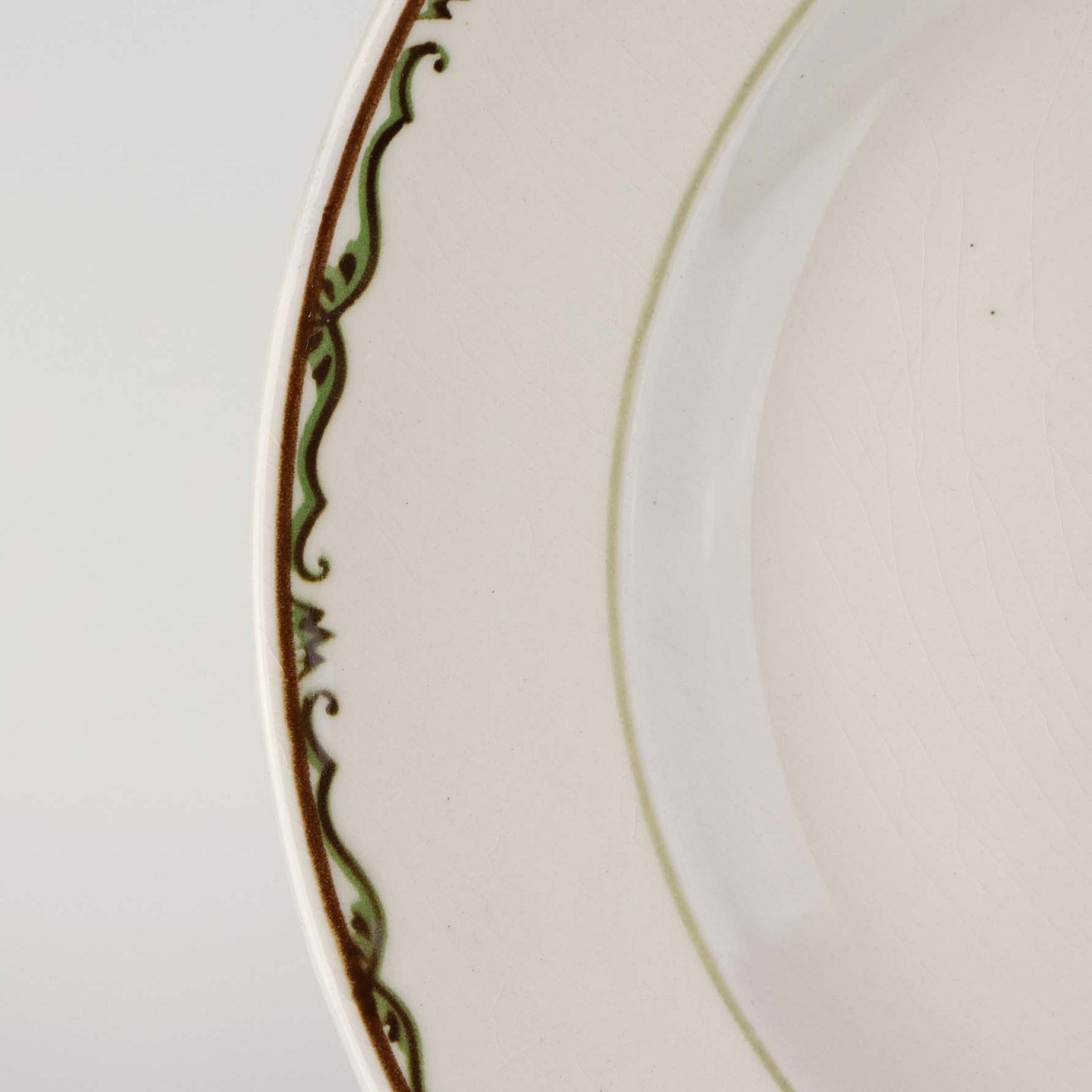 Fajancestel i stelform G med dekoration af orangegule blomster og grønne guirlander på lys baggrund med brun kant.