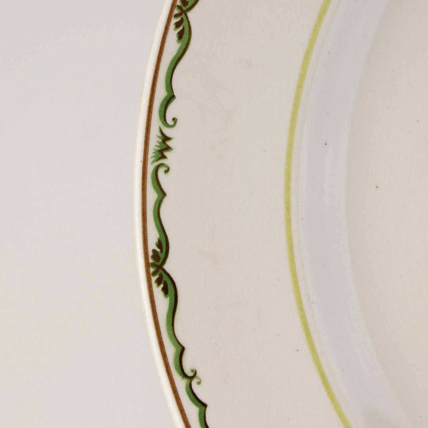 Fajancestel i stelform G med dekoration af orangegule blomster og grønne guirlander på lys baggrund med brun kant.
