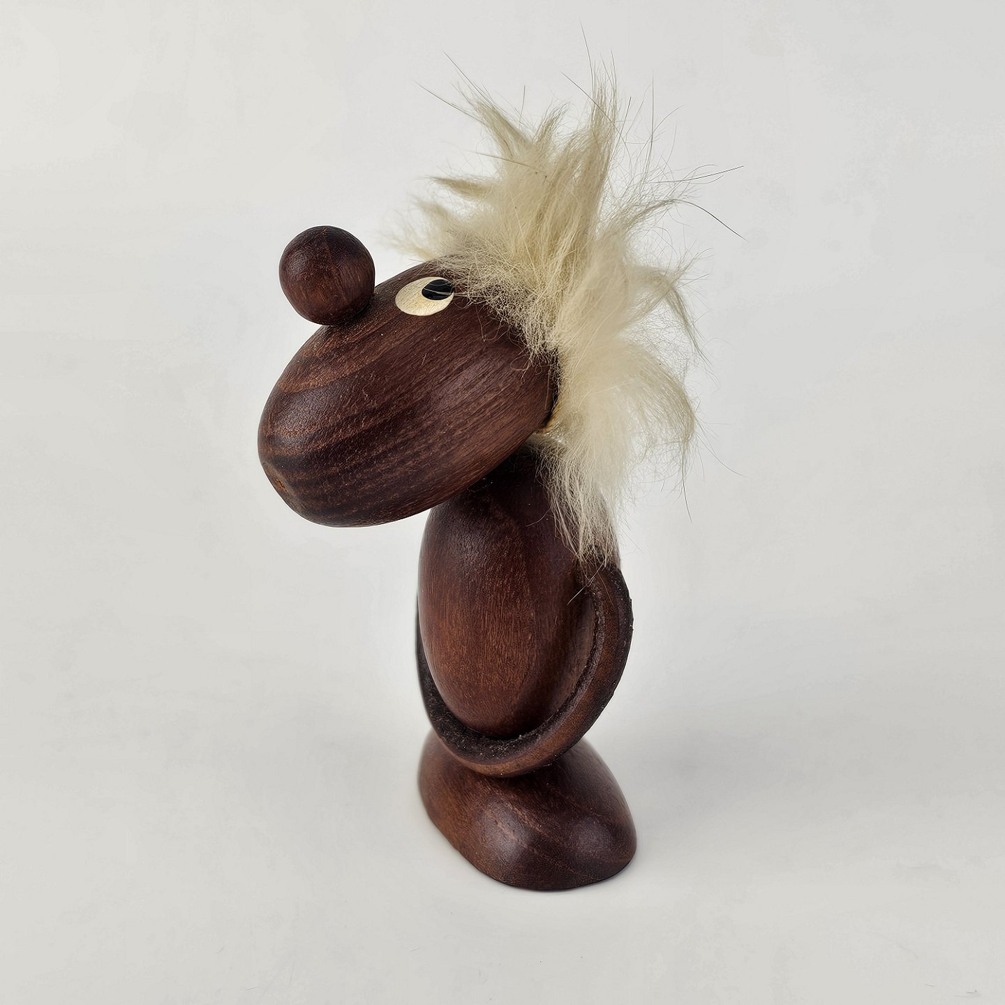 Håndskåret figur af teak med blond hår og arme af læder. Fra 1960'erne