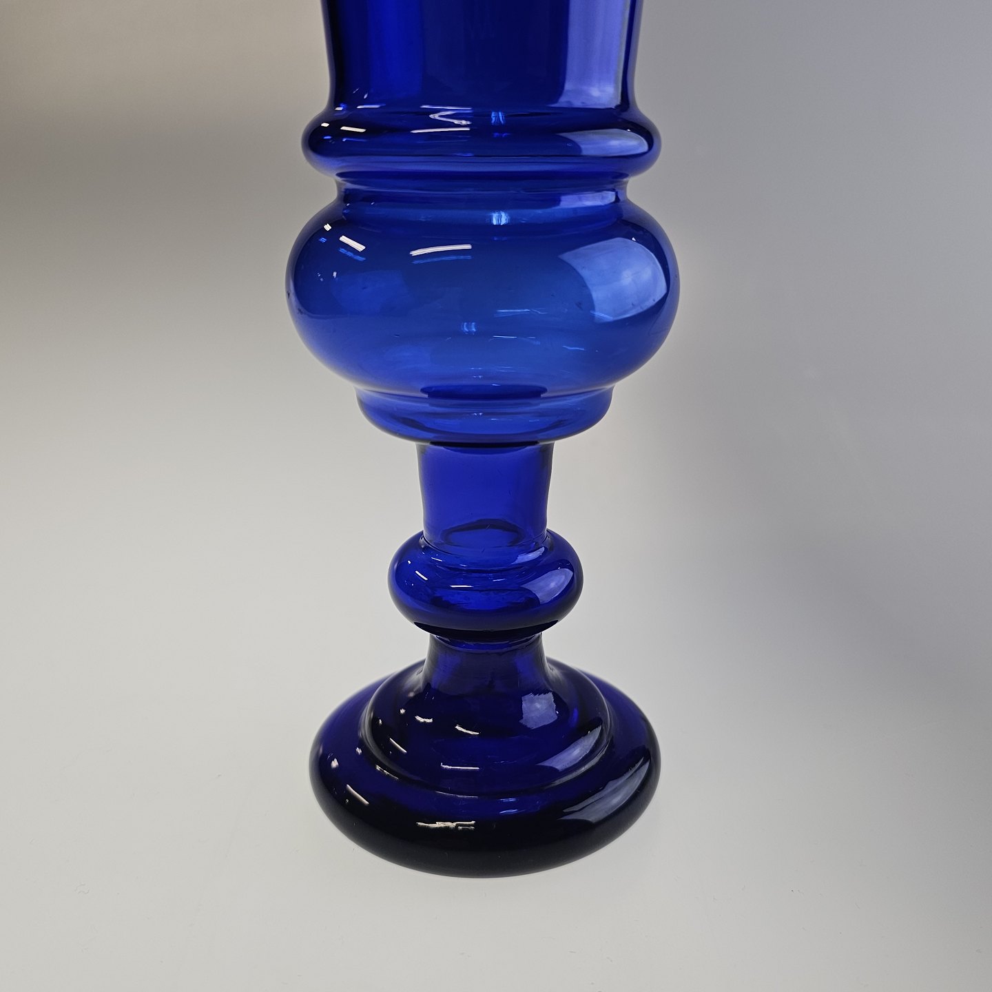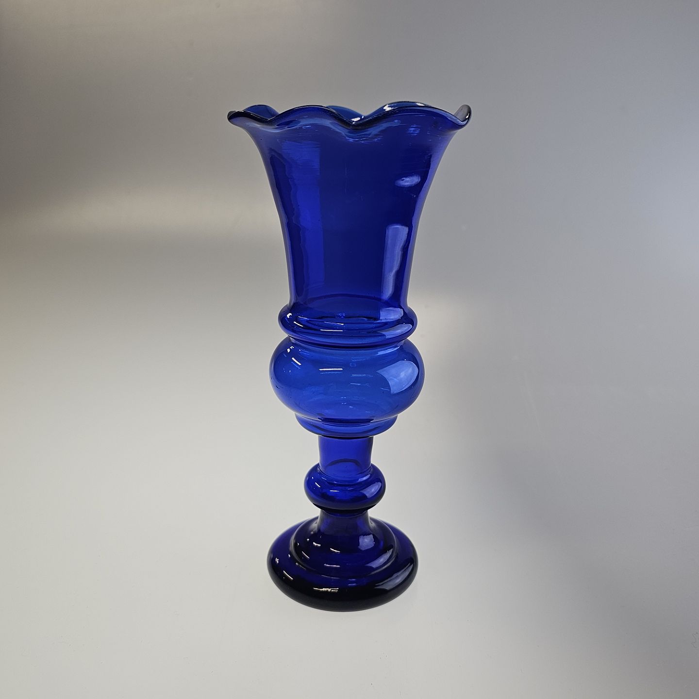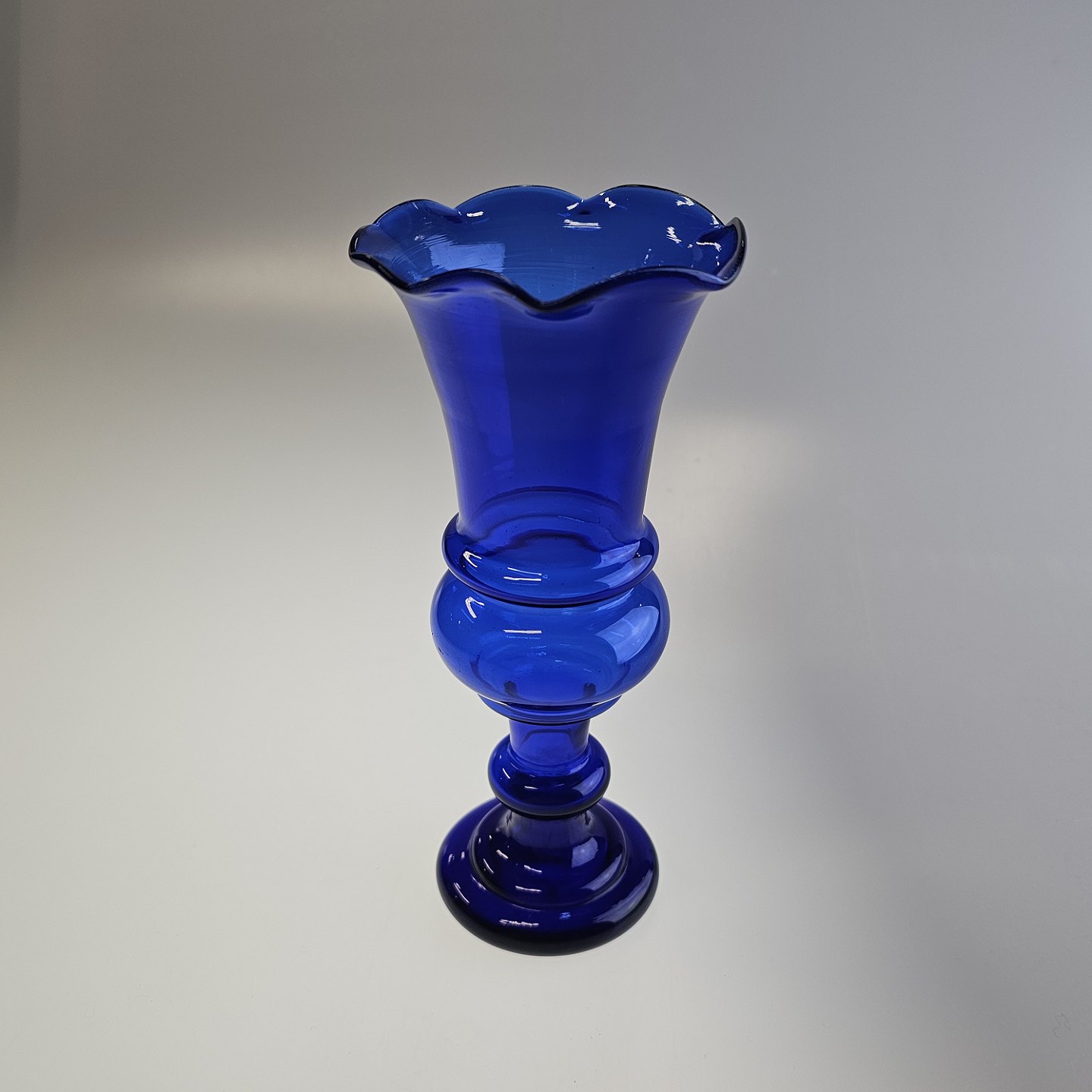 Håndblæst hyacintvase i blåt glas med buet kant