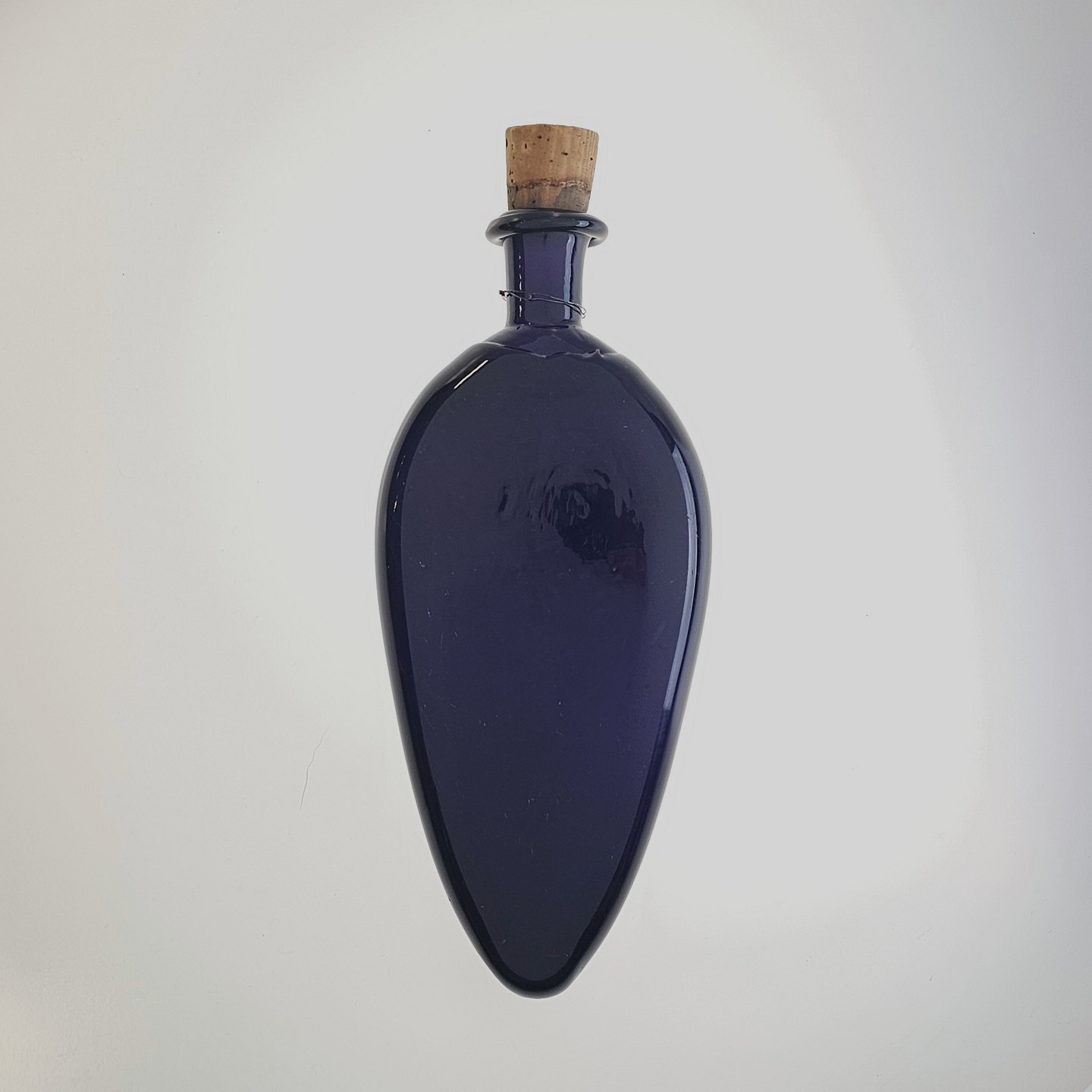 Håndblæst dråbeformet flaske i lilla glas med korkprop