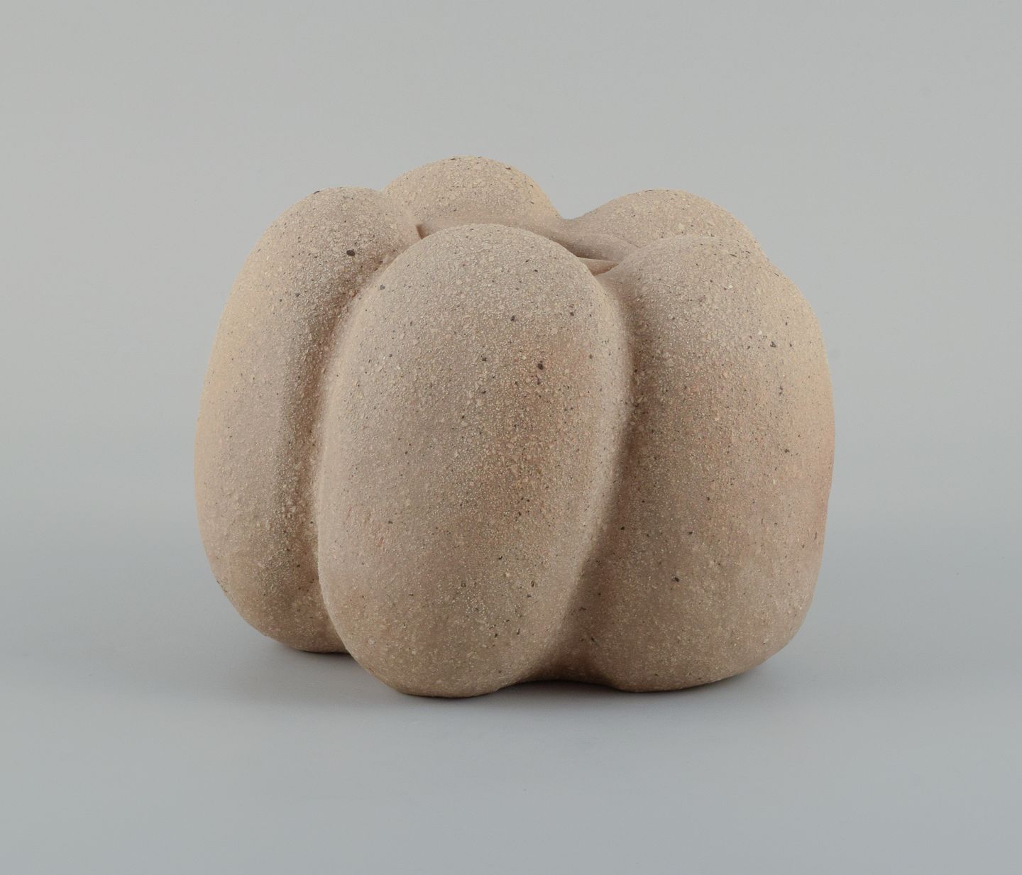 Small, unique stoneware seedpod vase. Unglazed, with specks the vessel is organically shaped.