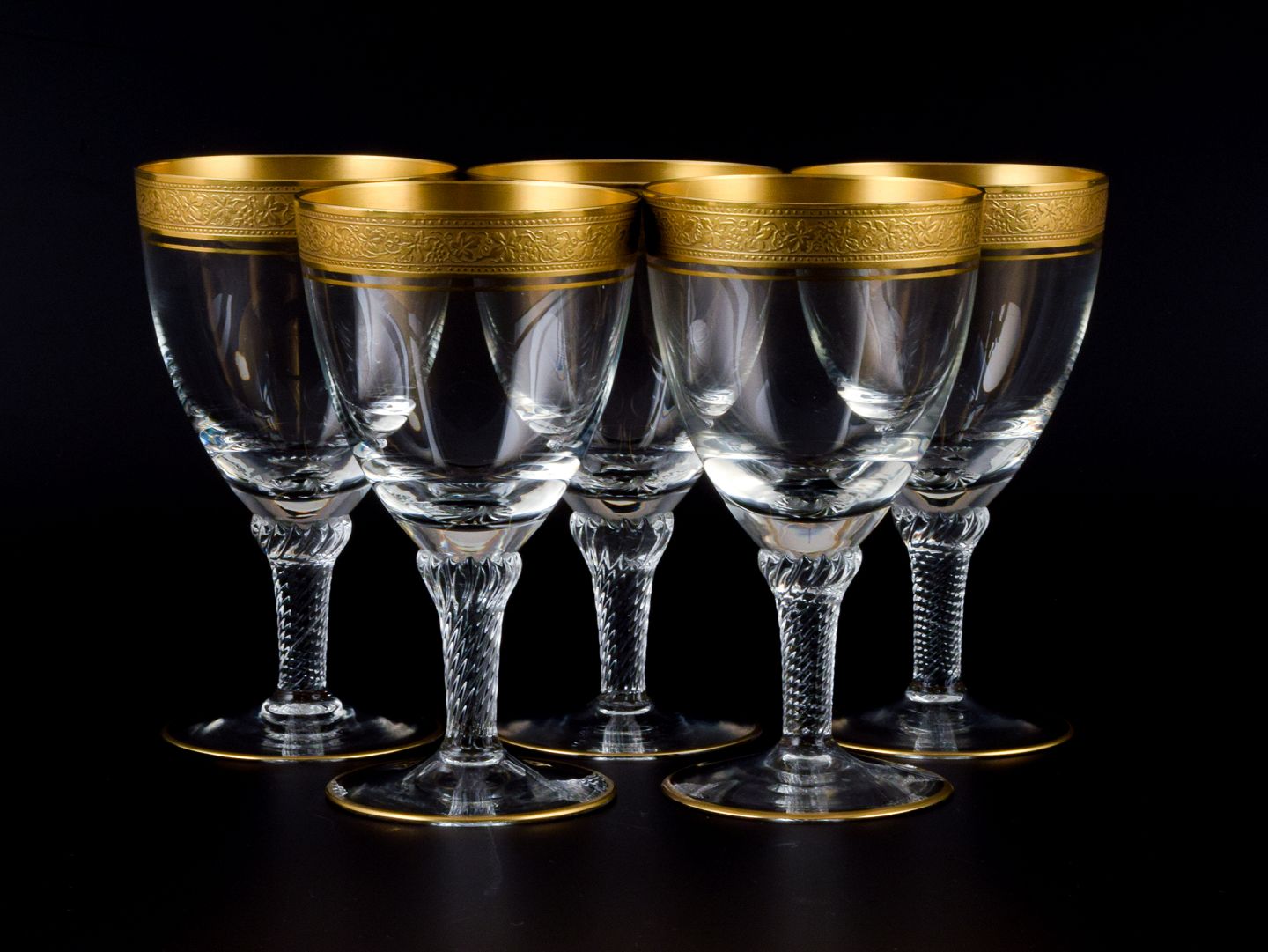 Rimpler Kristall, Zwiesel, Germany, five hand blown crystal red wine glasses with gold rim decorated with grapes and vine leaves. 1960s. In perfect condition. Dimensions: H 13.5 x D 7.5 cm.