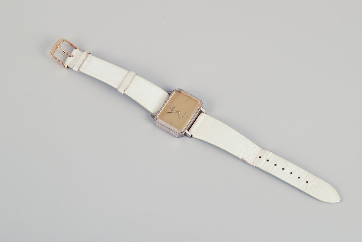 Omega De Ville. Wristwatch with a white leather strap. Approximately 1980. In perfect condition. The watch is running. Dimensions: 32 mm.
