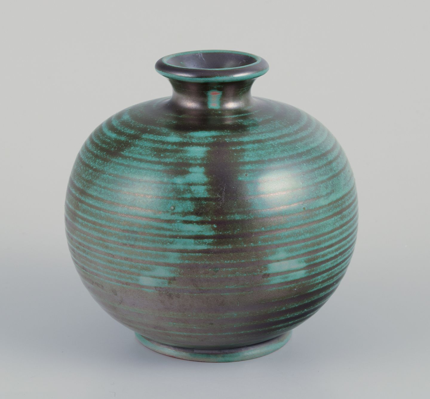 Upsala Ekeby, Sweden. Ceramic vase with glaze in green and black stripes. From around 1940. Marked. In excellent condition with minimal signs of use. See photo. Dimensions: H 11,5 cm. x D 11,0 cm.