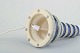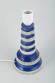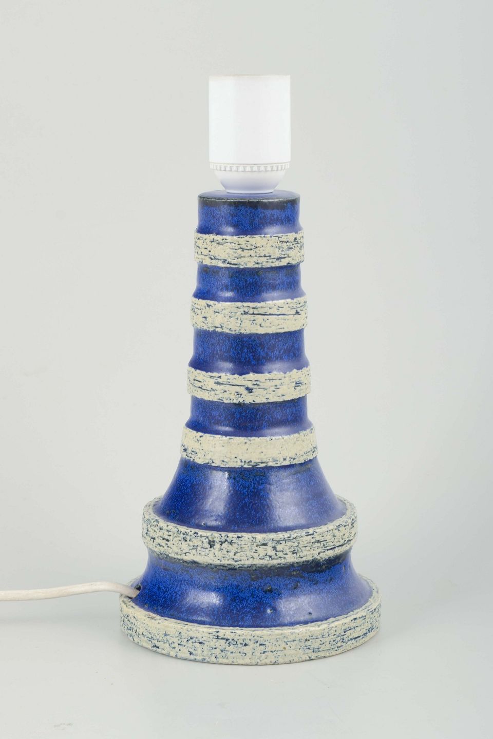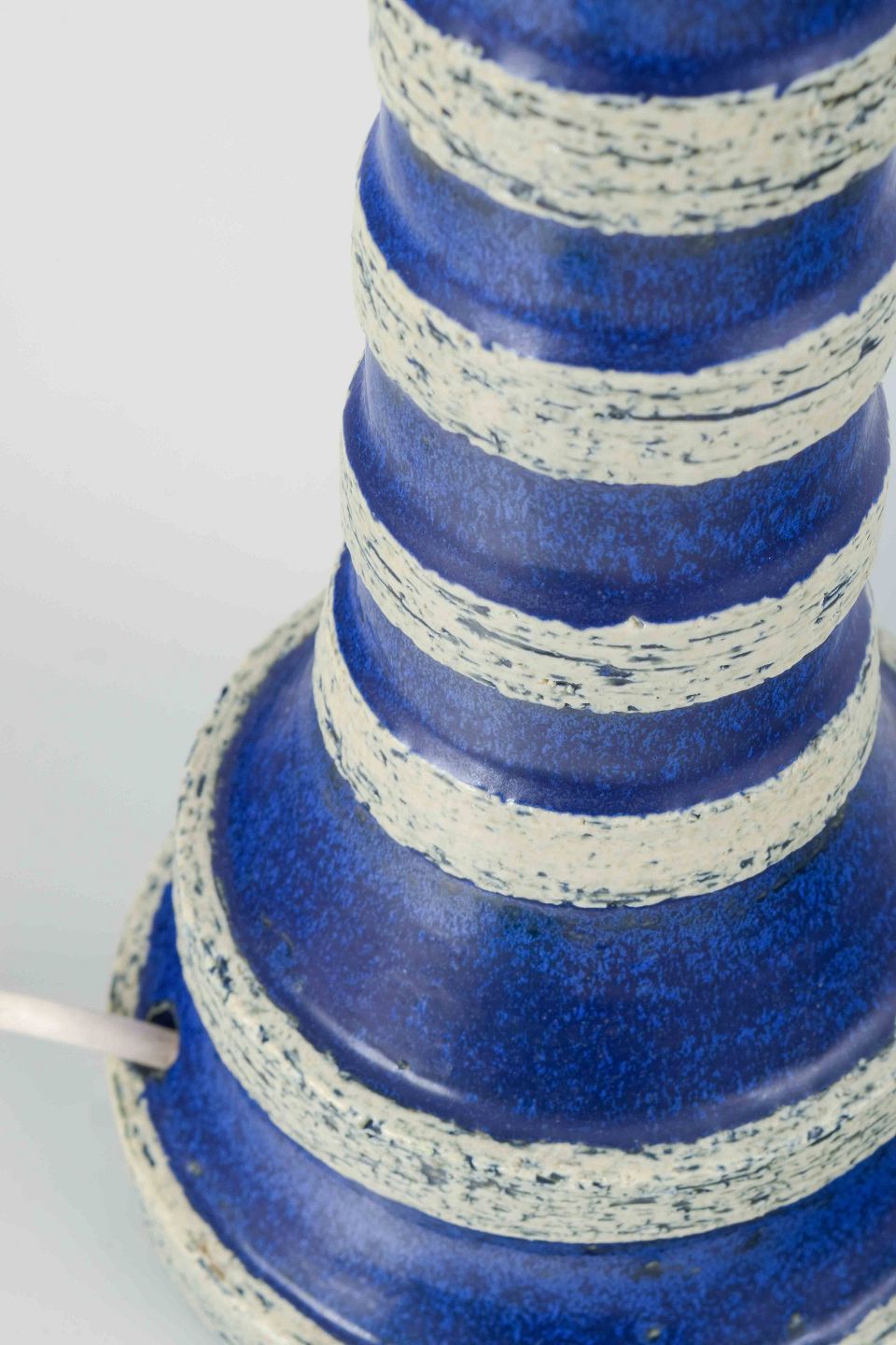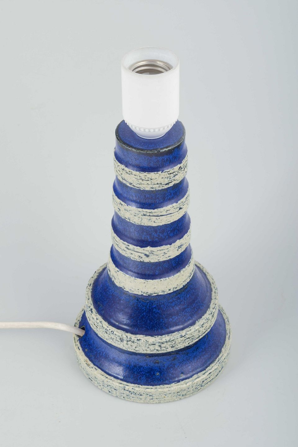 Conical stoneware lamp base with blue glaze and raw white relief bands.