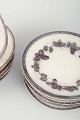 Sæt med 12 runde fajancetallerkener med reliefdekor og vinrankemotiv i brunlig tone langs randen.
