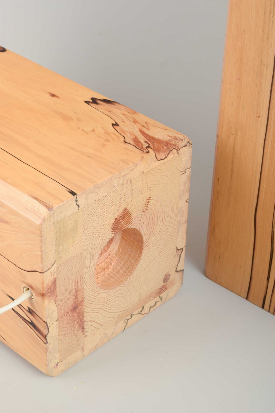 Organically shaped lamp base in solid wood with striking natural grain patterns. A simple cylindrical socket completes the clean, minimalist design.