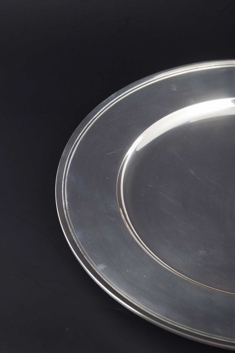 Klassisk rund dækketallerken af tretårnet sølv i enkel formgivning med let forhøjet kant, stemplet med tretårnet 830S.