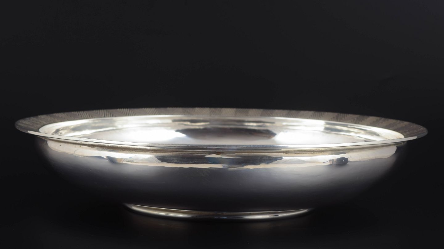 Rund sølvskål i sterlingsølv med glat spejlblank bund og kant dekoreret med indgraveret mønster.