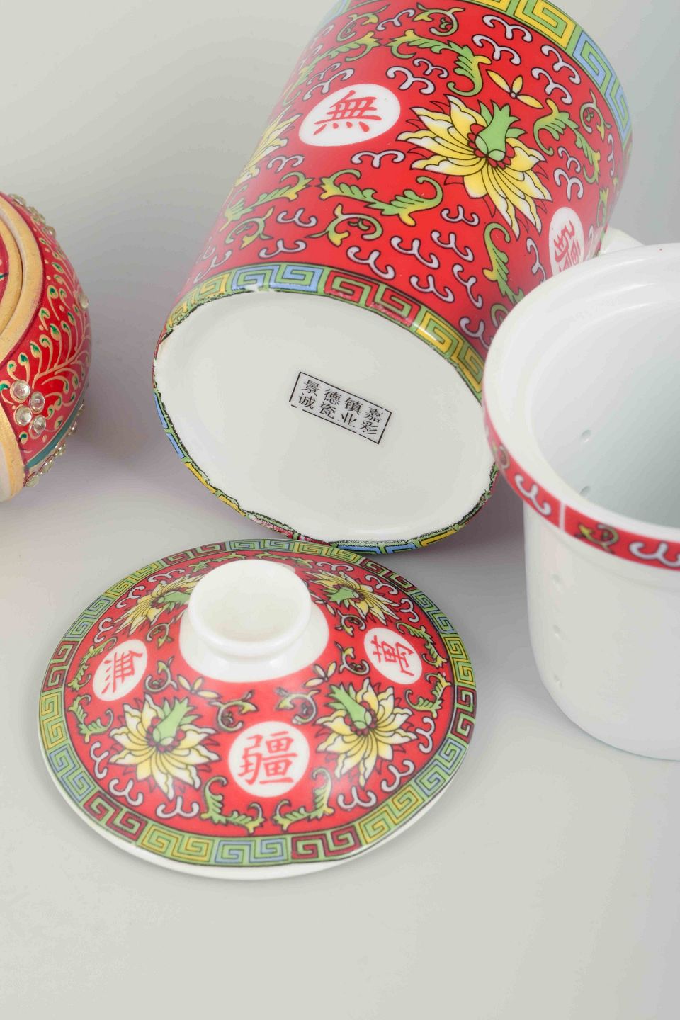 Chinese porcelain from the second half of the 20th century was largely produced for the international export market. Traditional motifs such as flowers, auspicious symbols, and calligraphic characters were combined with strong colours and modern production techniques. Sets like this were often made as functional decorative ware and gift items, representing a continuation of Qing dynasty decorative traditions in a modern context.