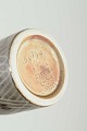 Cylindrisk formet vase i drejet stentøj med brunlig glasur og indridset geometrisk mønster i hvid dekoration.