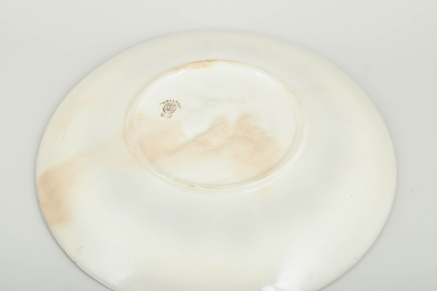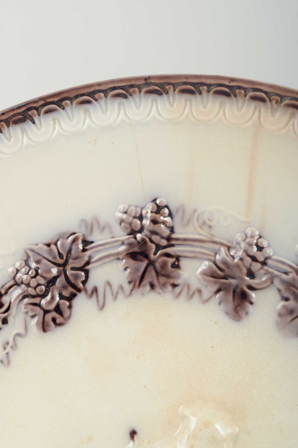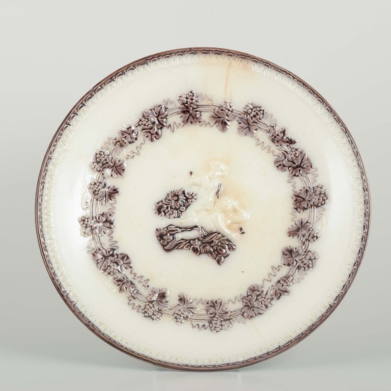 Rundt fajancefad med reliefdekor og transfertrykt vinrankemotiv i brunlig tone, centralt dekoreret med putti-figurer (små engle).