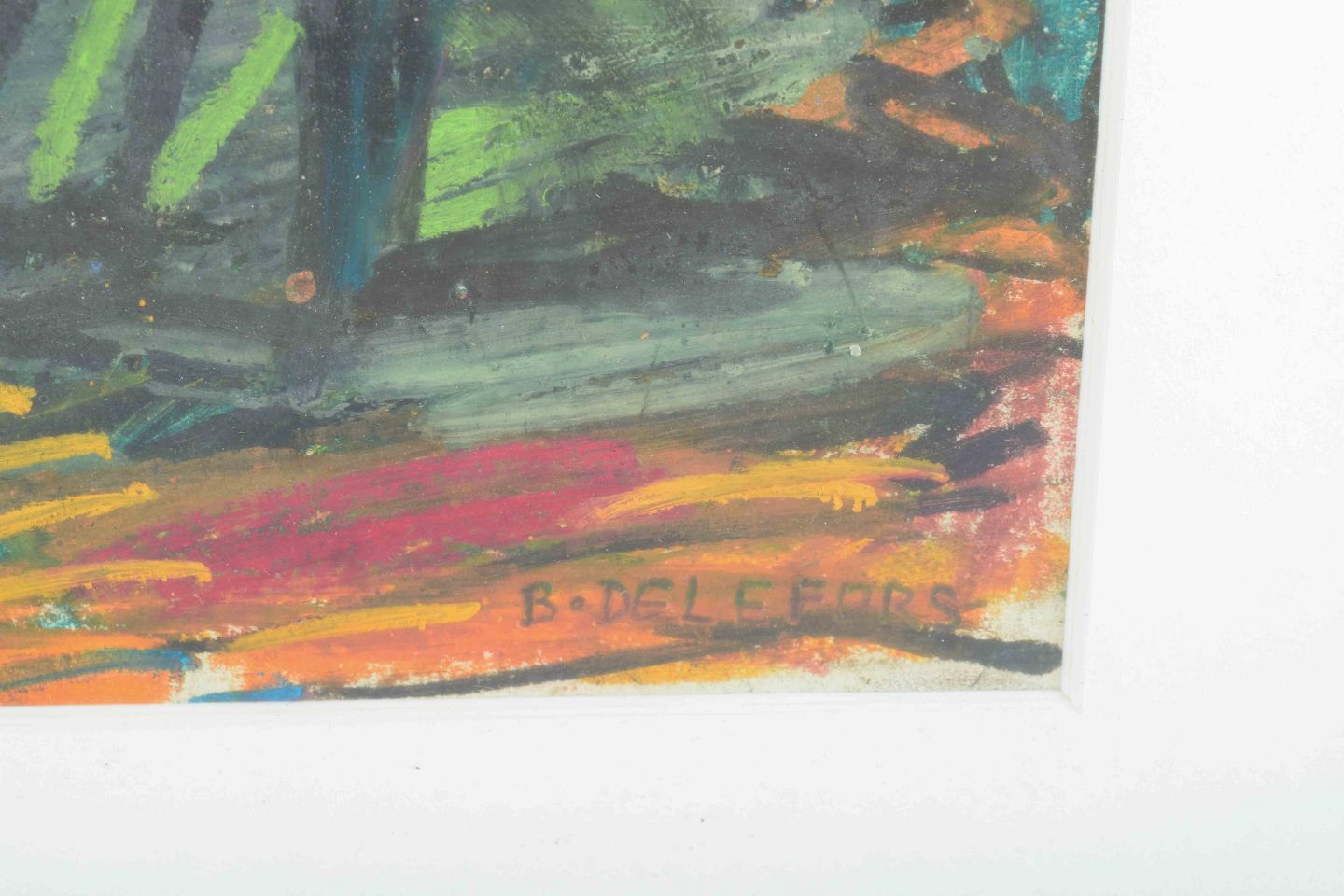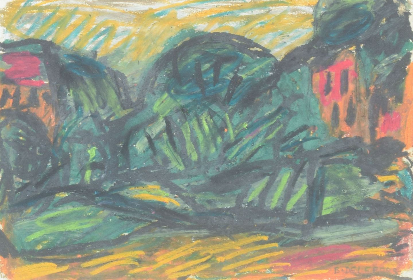 Et ekspressivt og farvemættet landskab, hvor grønne og blå toner dominerer billedfladen i et levende spil med røde og gule accenter. De brede, dynamiske penselstrøg og den rytmiske komposition understreger Delefors’ ekspressionistiske billedsprog.