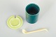 Organisk formet lågkrukke i glaseret stentøj i mørkegrøn med lyst låg og ske.