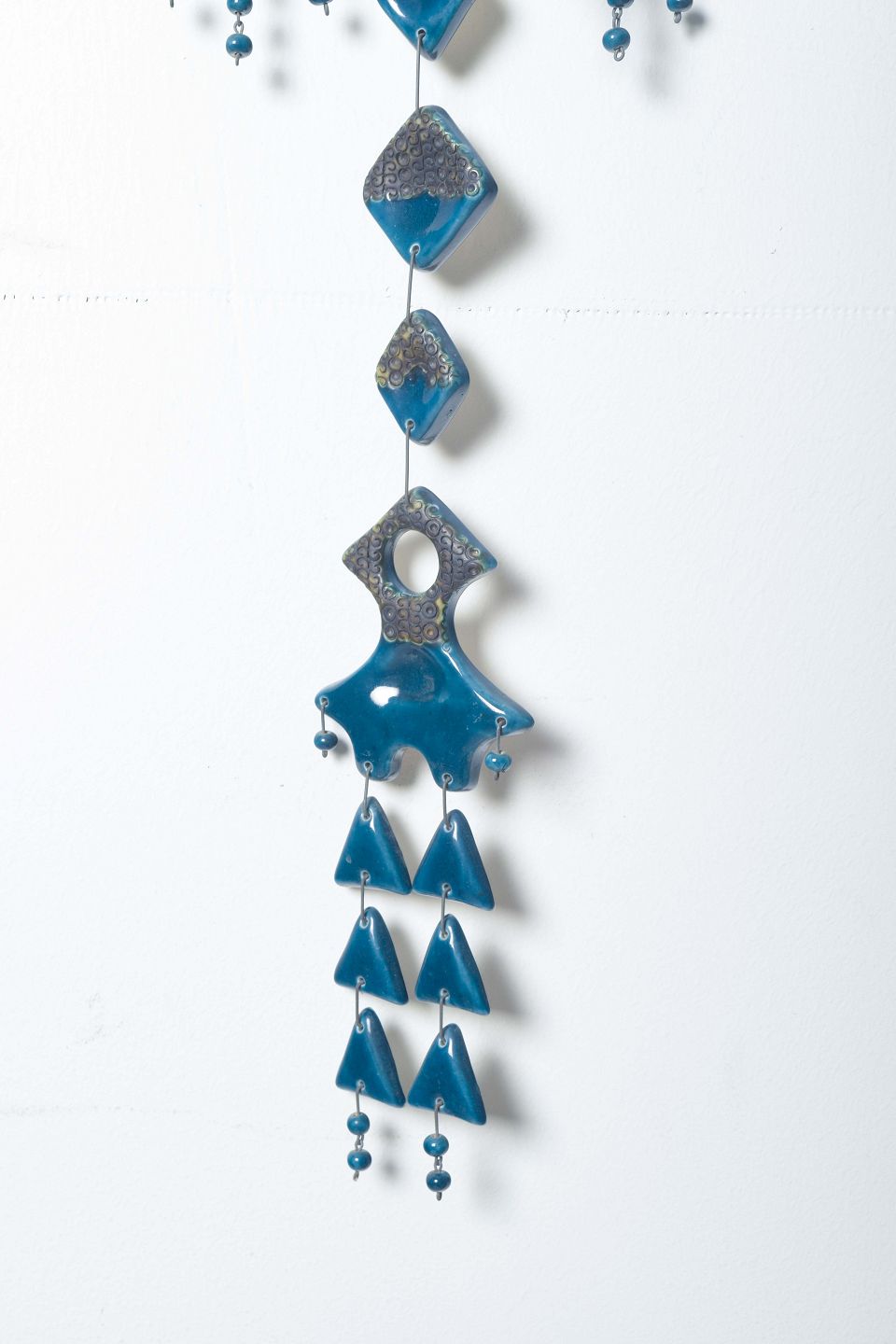 Handmade ceramic wall decoration in geometric and organic forms, glazed in blue and white tones. The hanging consists of multiple assembled elements, creating a sculptural and decorative expression.
