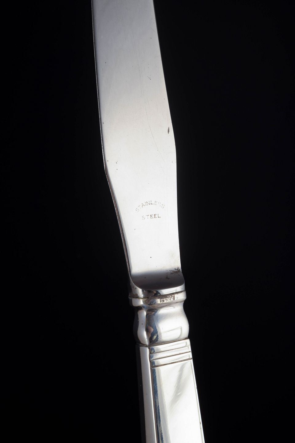 Sæt bestående af 4 middagsknive i det elegante “Blok / Acadia”-mønster, designet af Harald Nielsen i 1918. Knivene har sterlingsølvskafter kombineret med lange klinger i rustfrit stål. Designet er et klassisk eksempel på Art Deco-stilen med funktionalistiske linjer og geometriske proportioner.