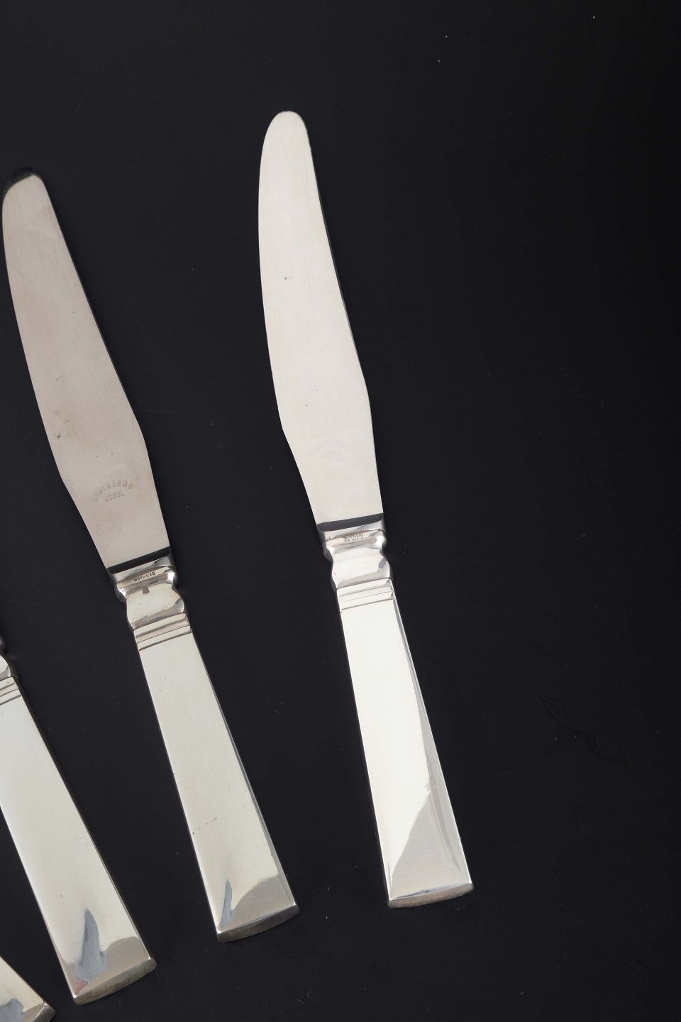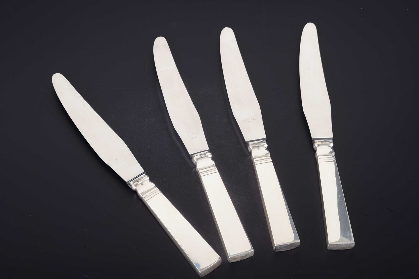 Sæt bestående af 4 middagsknive i det elegante “Blok / Acadia”-mønster, designet af Harald Nielsen i 1918. Knivene har sterlingsølvskafter kombineret med lange klinger i rustfrit stål. Designet er et klassisk eksempel på Art Deco-stilen med funktionalistiske linjer og geometriske proportioner.