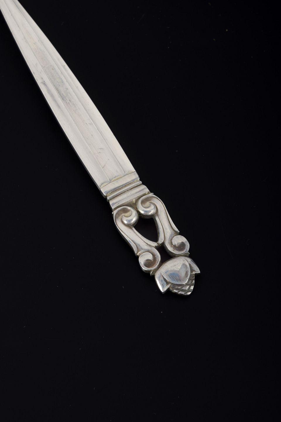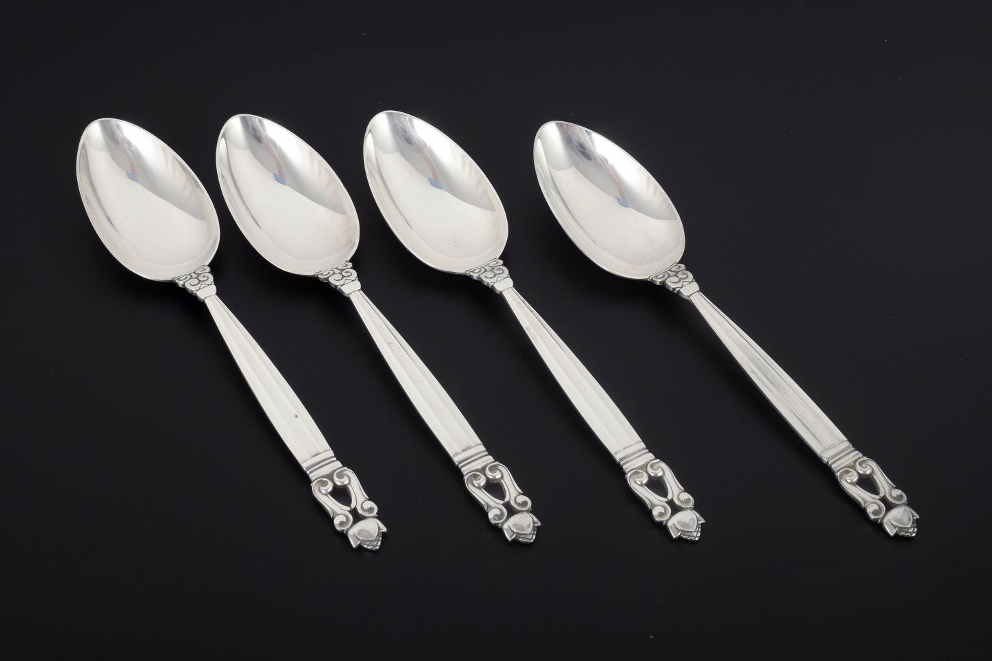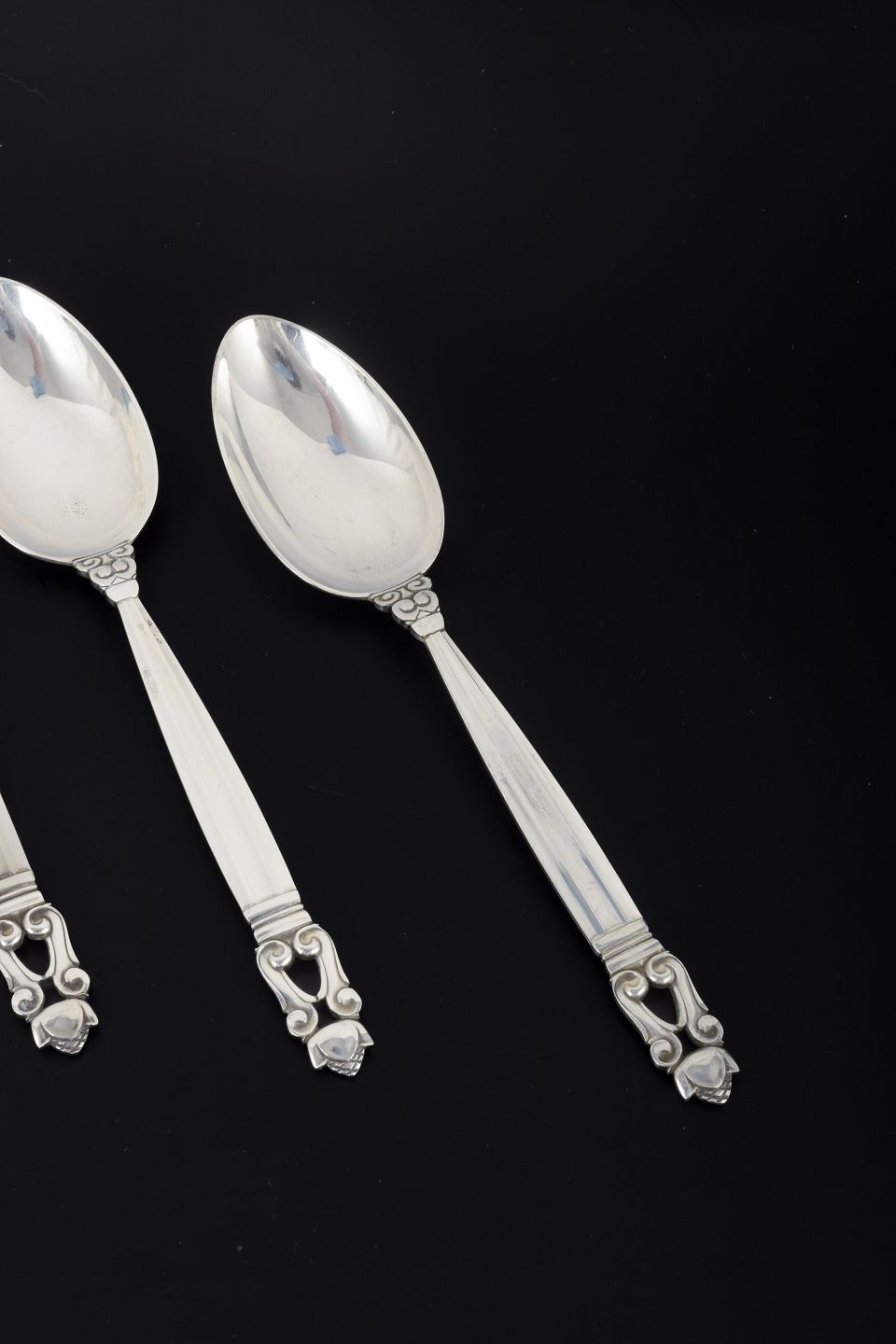 Sæt bestående af 4 suppeskeer i det klassiske “Konge / Acorn”-mønster, designet af Johan Rohde i 1915. Elegant udført med skaft dekoreret af akantusblad og agernmotiv.