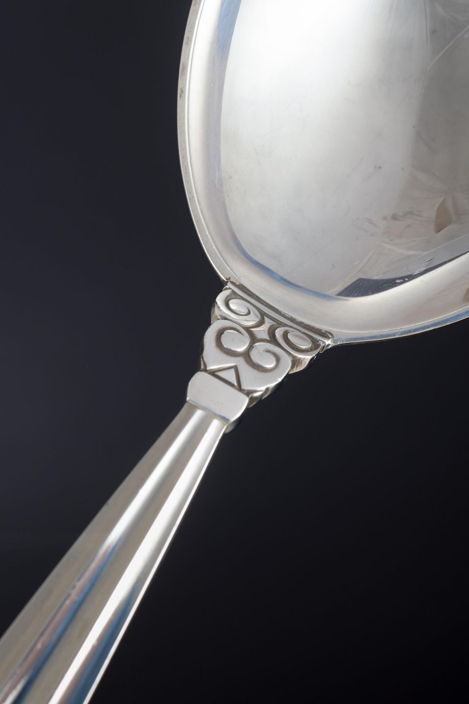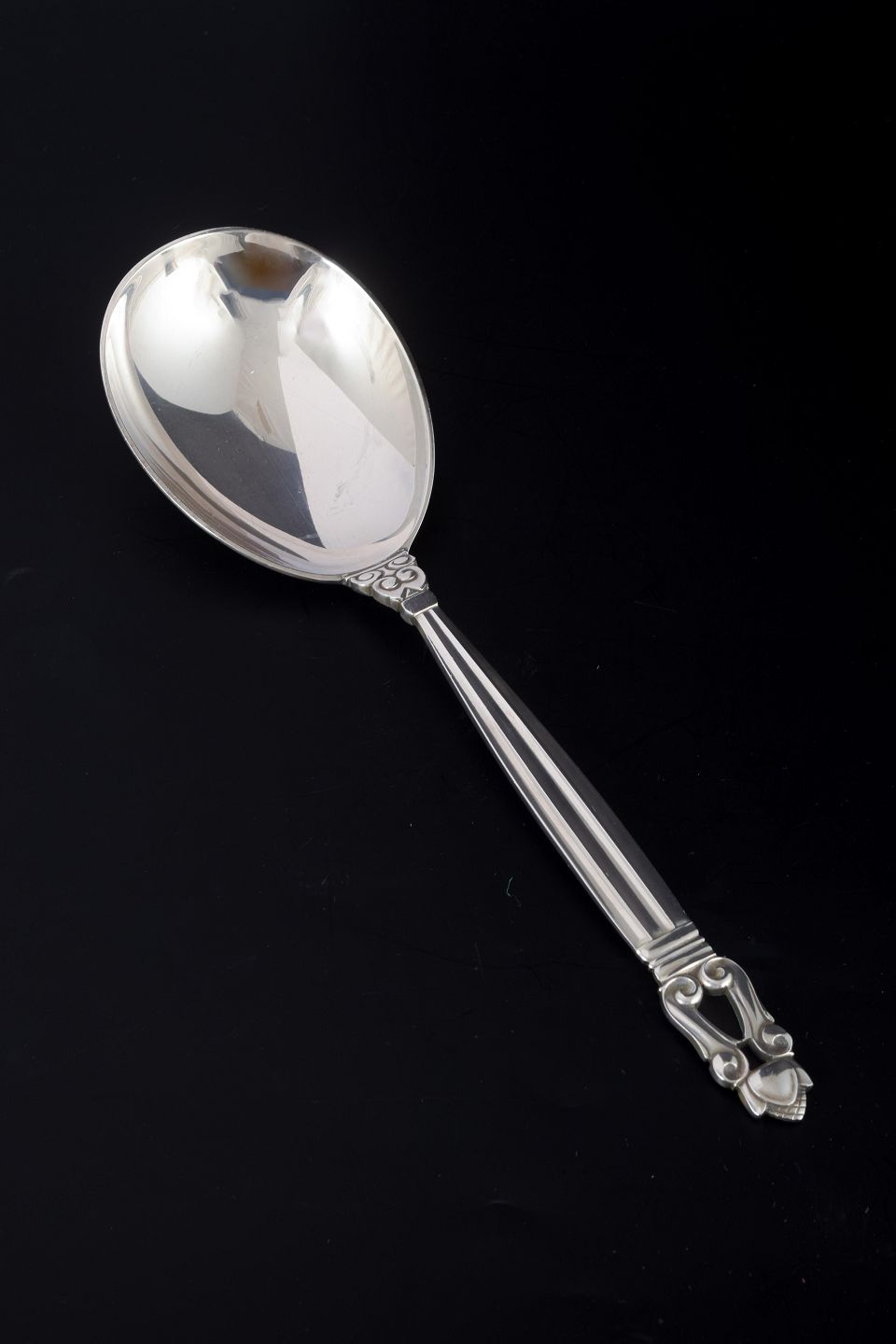Elegant serveringsske i det klassiske “Konge / Acorn”-mønster, designet af Johan Rohde i 1915. Dekoreret med det karakteristiske akantusblad og agernmotiv.