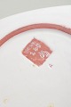 Organisk formet serveringsfad i glaseret stentøj med grafisk radialdekoration i rødlige og hvide toner.