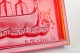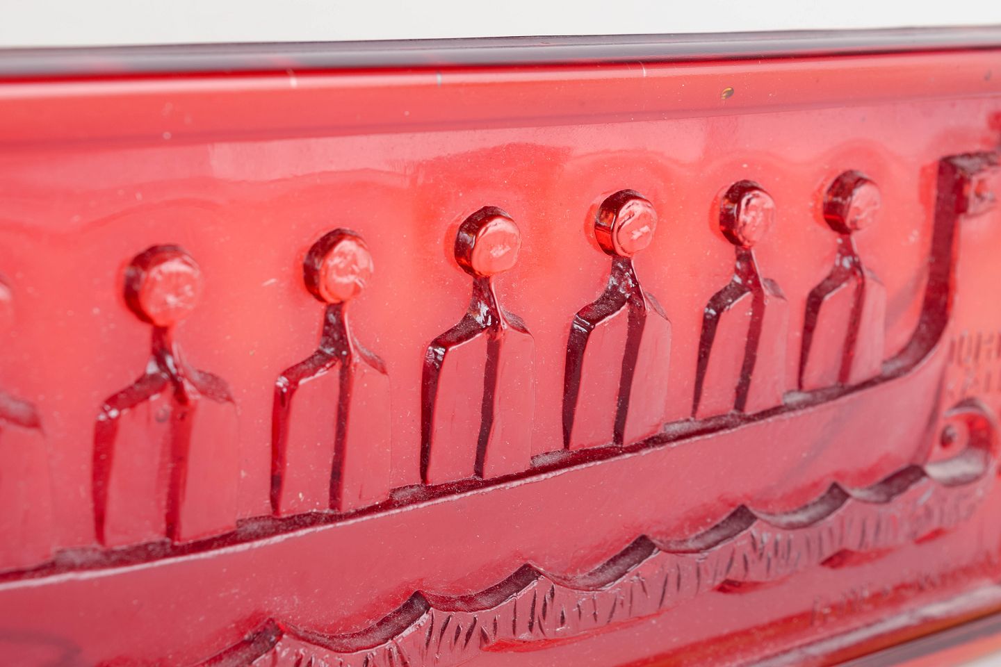 Rectangular wall hanging in deep red/orange glass, signed John Käll in mould and marked ELME SWEDEN. Stylised Viking longship with crew in procession and rolling wave motif.