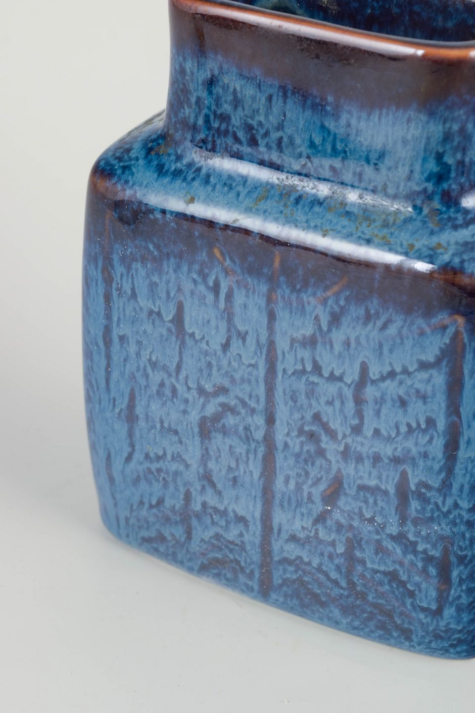 Rectangular stoneware vase with softly rounded edges and deep blue flowing glaze with brown tonal accents toward the rim.