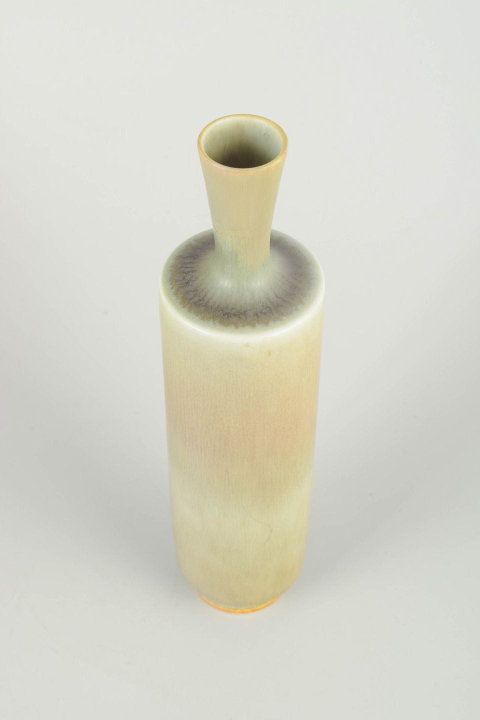 Hånddrejet stentøjsvase med elegant cylindrisk korpus og let udtrukket hals, dækket af fin, levende hare-pels glasur i lyse naturlige nuancer.