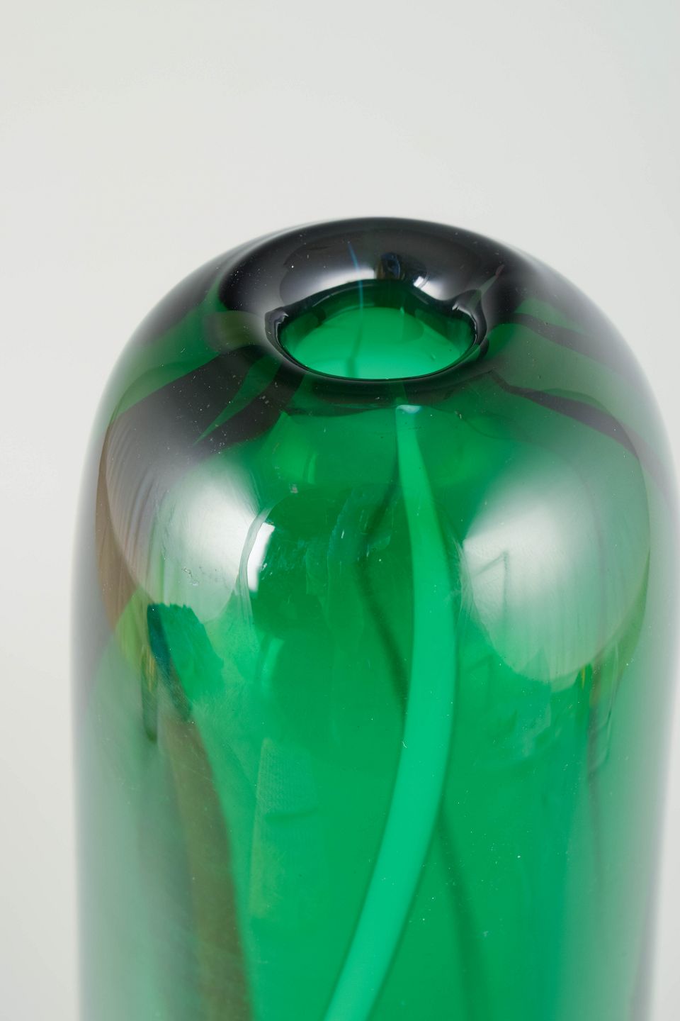 Mouth-blown Scandinavian studio glass with a graduated colour transition from blue to green. Large sculptural double-baluster form with slender neck.