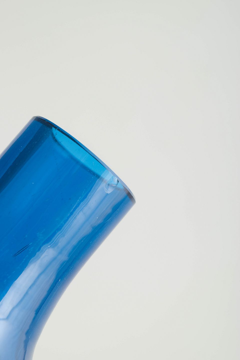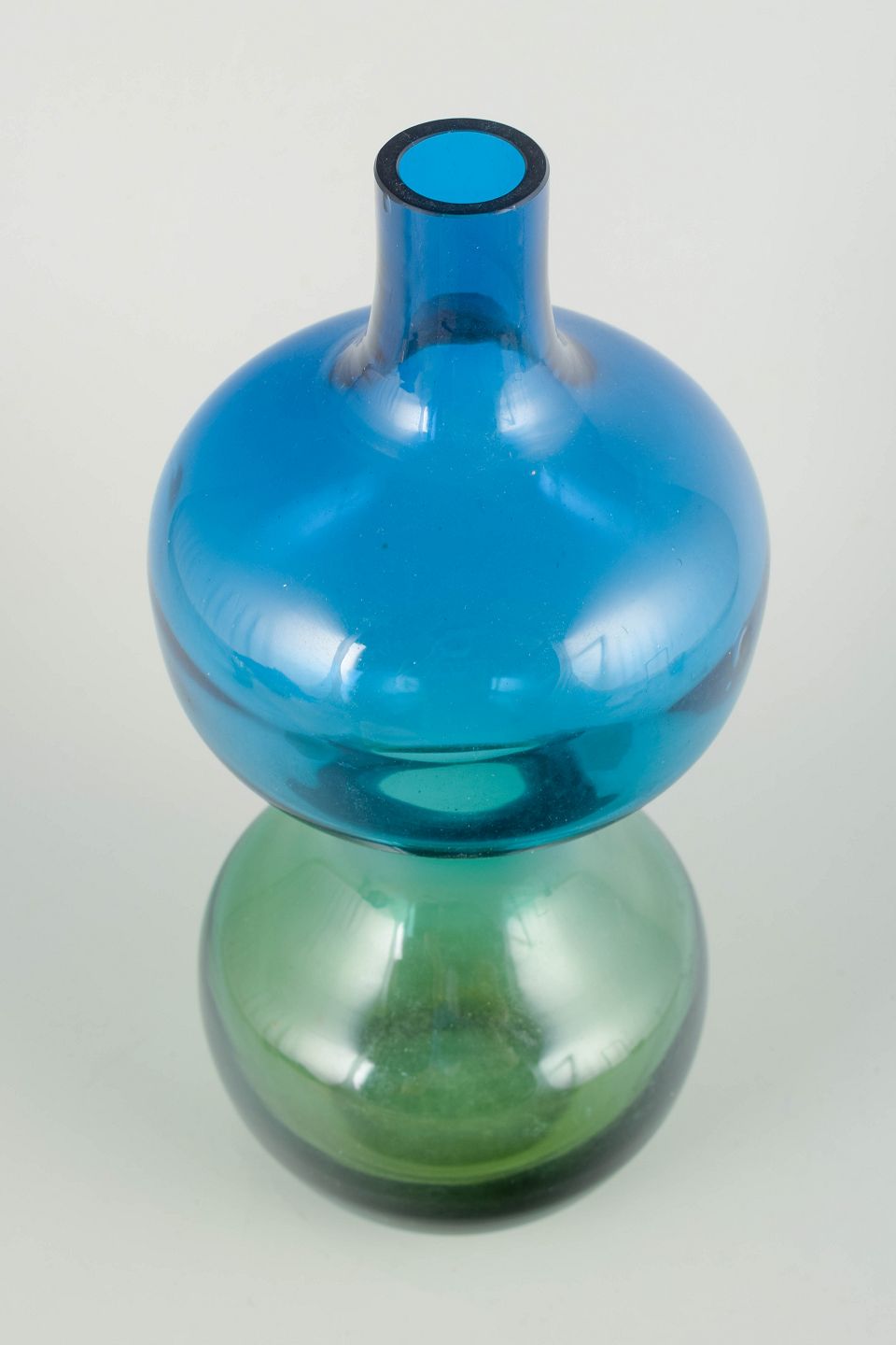 Mouth-blown Scandinavian studio glass with a graduated colour transition from blue to green. Large sculptural double-baluster form with slender neck.